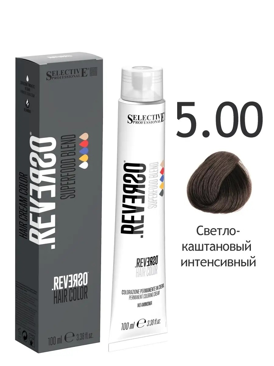 | Полное наименование товара | Крем-краска 5.00 Светло-каштановый интенсивный без аммиака с фреш-смесью SUPERFOOD, 100мл, REVERSO |