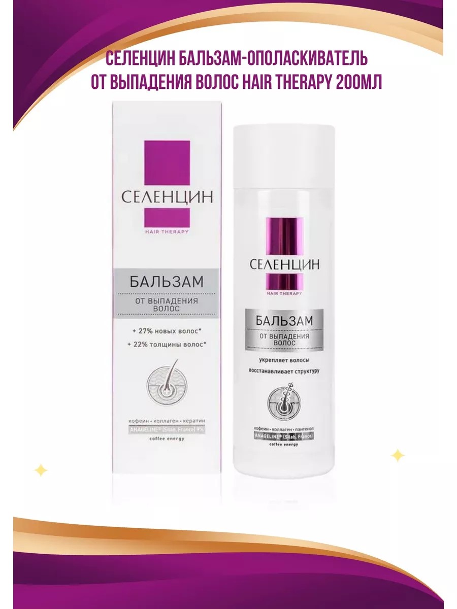 Бальзам-ополаскиватель Селенцин "Hair Therapy" — единственный бальзам, включающий в себя французский запатентованный ингредиент Anageline для эффективной борьбы с выпадением волос и мощный beauty-коктейль компонентов для восстановления красоты и здоровья волос. Бальзам является одним из лучших средств для ухода за выпадающими, ломкими, секущимися, пористыми и поврежденными волосами. С бальзамом Селенцин волосы более гладкие и послушные, приобретают зеркальный блеск и дополнительный объем, легко расчесываются. Благодаря легкой текстуре бальзам без проблем смывается с волос, не утяжеляя их.