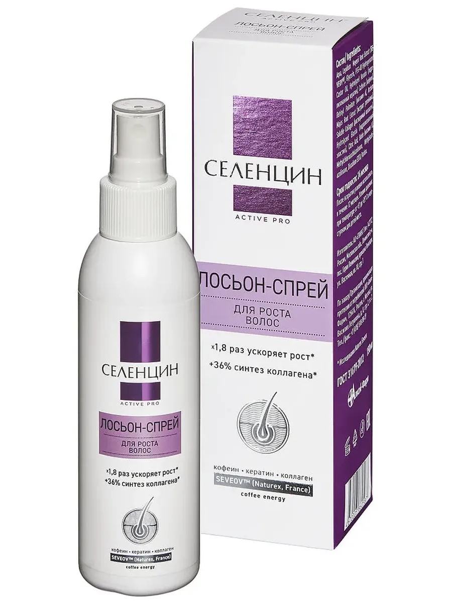 СЕЛЕНЦИН ЛОСЬОН-СПРЕЙ УКРЕПЛЯЮЩИЙ ОТ ВЫПАДЕНИЯ ВОЛОС HAIR THERAPY - однородная жидкость, от светло-желтого до желтого цвета, аромат легкий кофейный.Укрепляющий лосьон-спрей Селенцин Hair Therapy - уникальный лосьон на основе французского запатентованного комплекса Anageline, рекомендуемый для предотвращения хронического, длительного выпадения и поредения волос, для укрепления и восстановления жизненного цикла волосяных фолликулов. Селенцин Active Pro является одним из лучших средств для ухода за выпадающими, ломкими, секущимися и истонченными волосами. Улучшая микроциркуляцию крови и доставку питательных веществ непосредственно к корням волос, укрепляет корни, увеличивает диаметр каждого волоса и количество волос в стадии роста, препятствует выпадению тонких пушковых волос, переводя их во взрослую здоровую фазу.Укрепляющий лосьон-спрей Селенцин: останавливает выпадение волос и стимулирует рост новых, более крепких волос, укрепляет и укореняет волос в волосяной сумке, восстанавливает структуру волосяных фолликулов и стержня волос, увеличивает диаметр каждого волоса, укрепляет слабую кутикулу волоса, защищая от сухости, ломкости и повреждений, придает волосам плотность, блеск и объем.Активные компоненты Anageline - натуральный запатентованный активный ингредиент компании Silab (Франция) от выпадения волос и для продления жизни каждого волоса.Кофеин - природный стимулятор роста волос, мощный антиоксидант, защищающий волосы от вредного воздействия.Экстракты крапивы и хмеля - традиционные компоненты для укрепления волос, предупреждения их ломкости и сечения, восстановления жирового баланса кожи головы.Гидролизат коллагена, кератин и биотин - эффективные компоненты для восстановления внутренней структуры и оболочки волос, их уплотнения, питания и блеска.Витамин А - витамин для восстановления упругости и блеска волос.