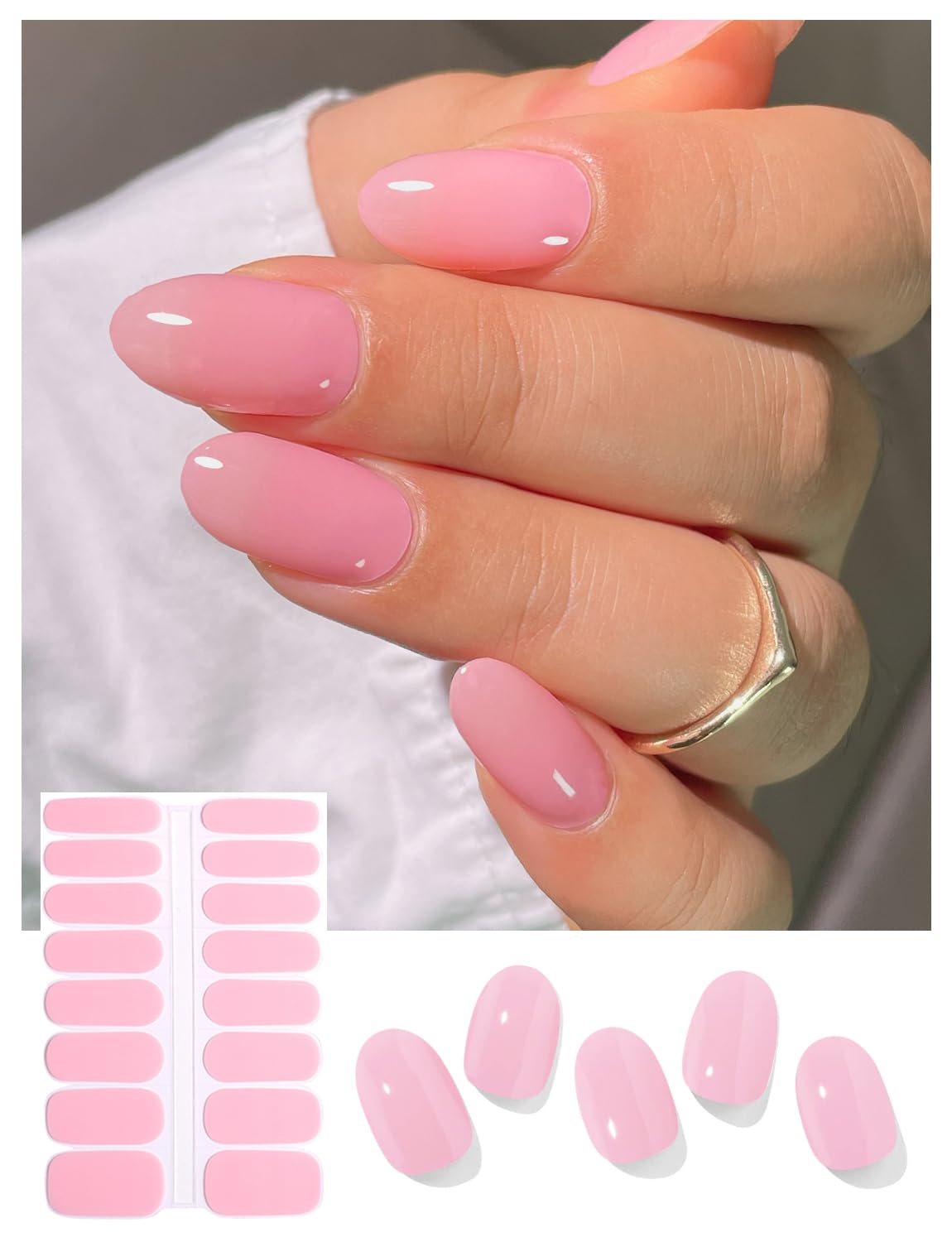 Semi Cured Gel Nail Strips (Jelly Pink)-16 Pcs UV Nail Stickers | UV Light Required | Gel Nail Wraps Light Slimmer And More Translucent