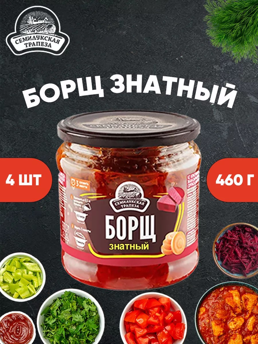 Semilukskaya Trapeza (Semiluk Meal) ready-made soups are an excellent option for a healthy and delicious product. Use one can per 0.5 liters of water. Cook for 3-4 minutes. We recommend using your own meat broth; it's delicious! Vegetable soups, made with carefully selected vegetables, are ideal as a side dish or as a standalone dish. Add the prepared soup to the meat broth, bring to a boil, and you've got a delicious first course! Semiluksky Soup, a ready-made, filling, and delicious dish, is one of the popular canned vegetables, especially outside of harvest season. These soups are perfect for breakfast, lunch, and dinner at any time of day. Soups made with natural vegetables and grains can also be served as a ready-made meal. The product is suitable for active recreation enthusiasts (fishermen, hunters, travelers, tourists), as well as summer residents and housewives, as well as those who maintain a healthy diet. Semilukskie ready-to-eat meals are made exclusively from natural ingredients, without artificial additives or GMOs. Vegetable soups are made according to technical specifications, and the glass jar packaging with a lid is convenient for use and storage after first opening. "Semilukskaya Trapeza" soups include flavors such as Borscht, Georgian Kharcho, Boyar's Shchi, Merchant's Rassolnik, Pea Soup, and Lazy Mushroom Soup! Semilukskaya Trapeza products include not only ready-made soups, but also vegetable appetizers, ketchups (Caucasian, Spicy, Sweet, Tomato, Chili, and Shashlik), main courses, soups, first courses, lecho, adjika, sauces: cheese, mustard, tomato, tomato pastes, ready-made meals, and much more! Enjoy the delicious and filling Semilukskaya Trapeza products!