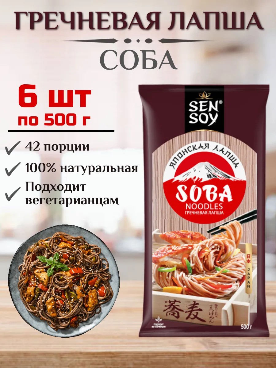 Японская лапша Soba готовится с использованием гречневой муки, чем и объясняется ее коричневатый цвет и мягкий своеобразный оттенок вкуса. Такая лапша очень хороша в различных японских супах из мяса и птицы, а также в холодных салатах - овощных или мясных.