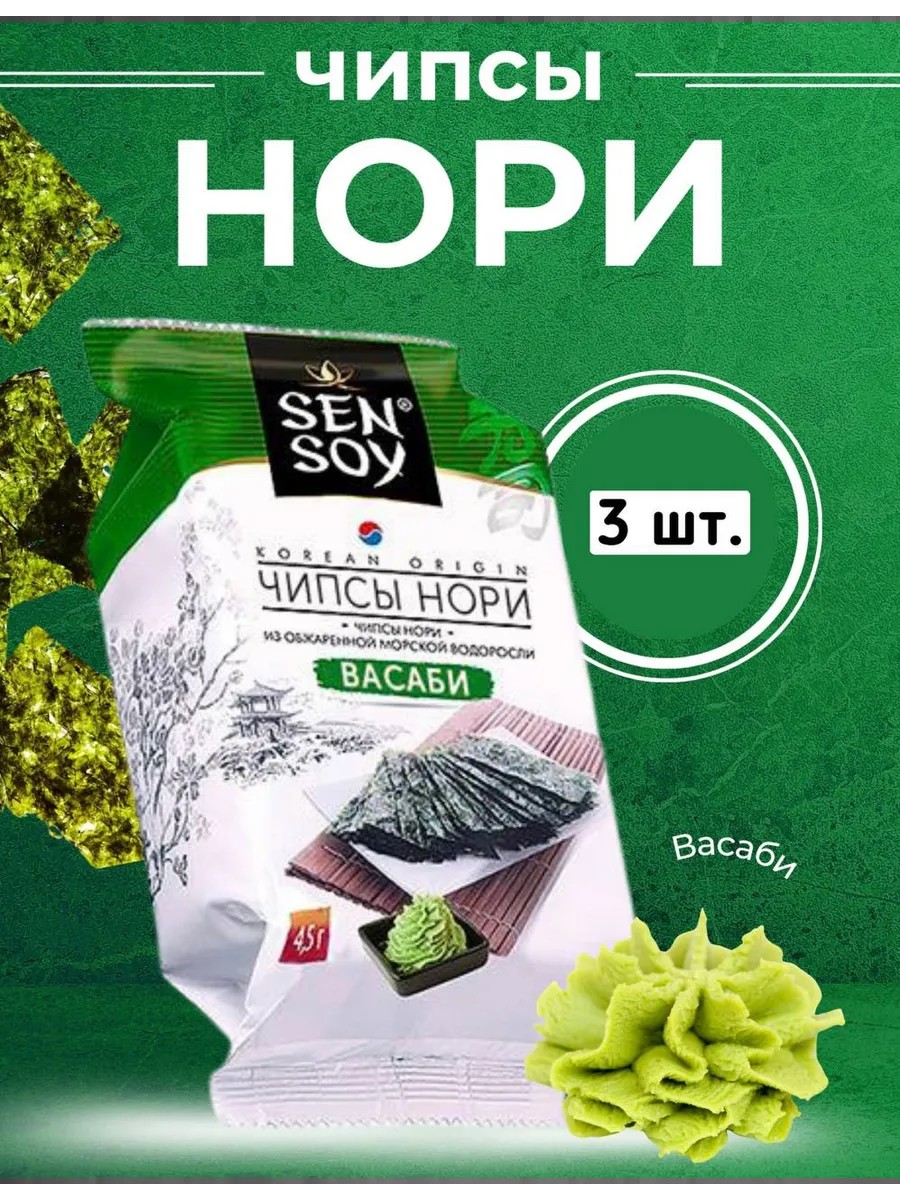 Nori Sensoi seaweed is a convenient and healthy snack to take with you. Each package contains crispy nori sheets with a unique wasabi flavor. Nori chips contain a rich array of micro and macronutrients: iodine, phosphorus, magnesium, iron, and sodium. They also contain all the B vitamins, as well as large amounts of vitamins E, A, C, and D. Recommended for vegans, vegetarians, and those fasting or dieting. Nori seaweed is light and considered a healthy product.