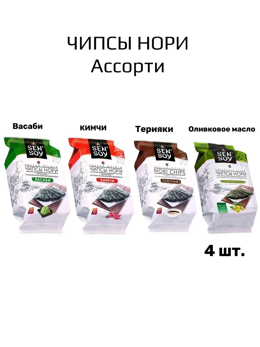 Морская капуста нори сенсой- это удобный и полезный снэк с собой, в каждой упаковке содержатся хрустящие листы нори с неповторимым вкусом. В наборе чипсы нори со вкусом: оливкового масла, кимчи, васаби и с терияки. Чипсы нори содержат богатый набор микро и макро элементов: йод, фосфор, магний, железо, натрий. Все витамины из группы В, а также в большом количестве витамины Е, А С и Д. Чипсы нори ассорти рекомендованы для веганов, вегатарианцев и людей, соблюдающих пост и диету. Водоросли нори легкие и считается полезным продуктом.