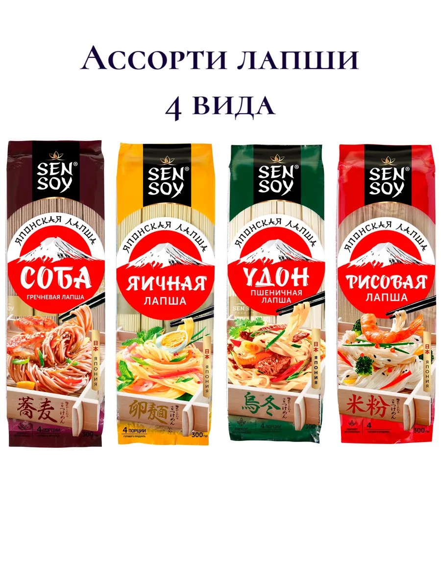 В данное ассорти входят четыре вида: Соба (гречневая лапша), Удон (пшеничная лапша), Рисовая лапша и Яичная лапша.