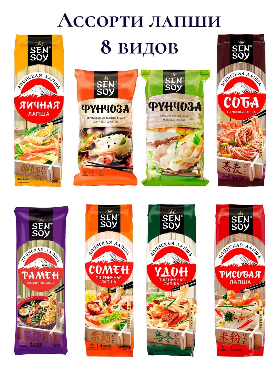 В данное ассорти входят восемь видов: Яичная лапша, Соба (гречневая лапша), Сомен (пшеничная лапша), Удон (пшеничная лапша), Рамен (пшеничная лапша), Рисовая лапша, Лапша Фунчоза и Вермишель Фунчоза.