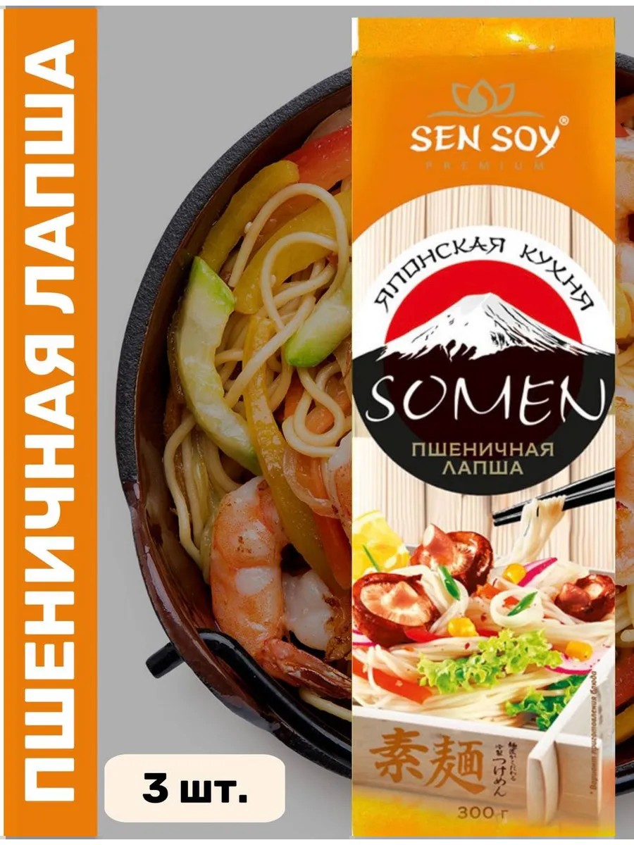 Пшеничная лапша Somen, длинная, очень ровная и тонкая, в сыром виде напоминает натянутые и застывшие белые нити. Подается отварной, тушеной или пассерованной с маслом и соевым соусом, обычно в горячем виде. Используется как гарнир к овощным или мясным салатам и в разнообразных горячих супах.