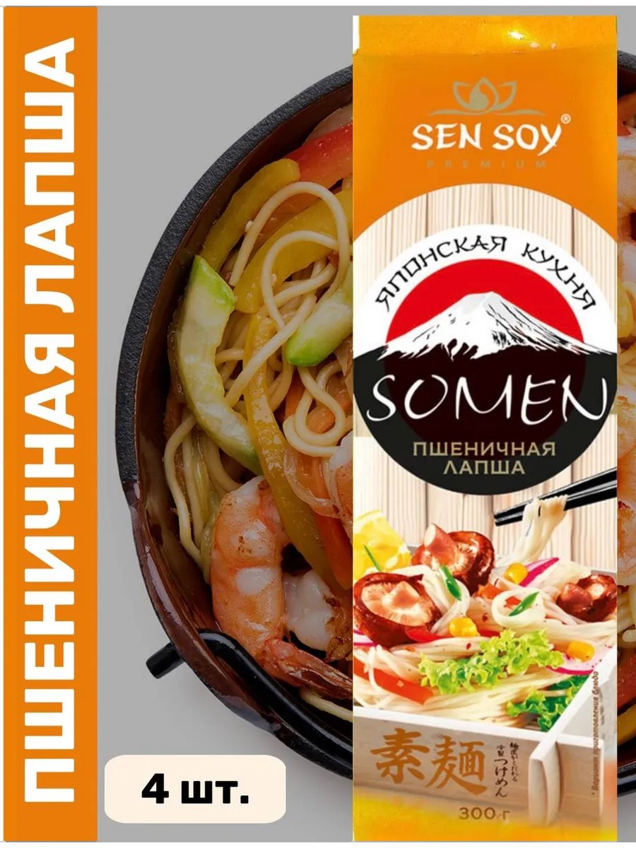Пшеничная лапша Somen, длинная, очень ровная и тонкая, в сыром виде напоминает натянутые и застывшие белые нити. Подается отварной, тушеной или пассерованной с маслом и соевым соусом, обычно в горячем виде. Используется как гарнир к овощным или мясным салатам и в разнообразных горячих супах.