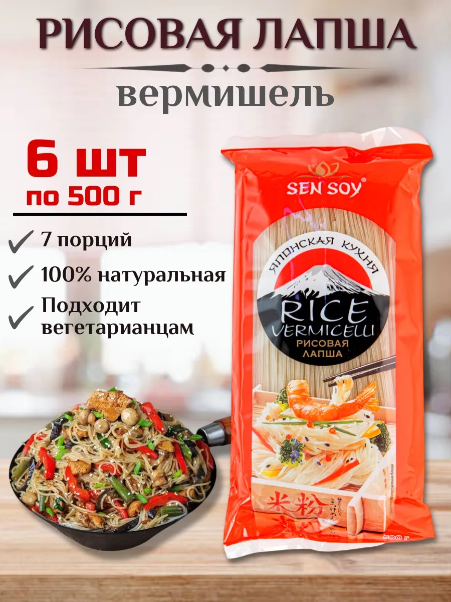Рисовая лапша, названная по-европейски Rice Vermicelli, представляет собой классическую рисовую японскую вермишель. Белоснежная и прозрачная, с нежным и мягким вкусом, она лучше всего подходит к морепродуктам. Эта вермишель хороша в разнообразных салатах и супах, а также в дополнение к блюдам из мяса и птицы