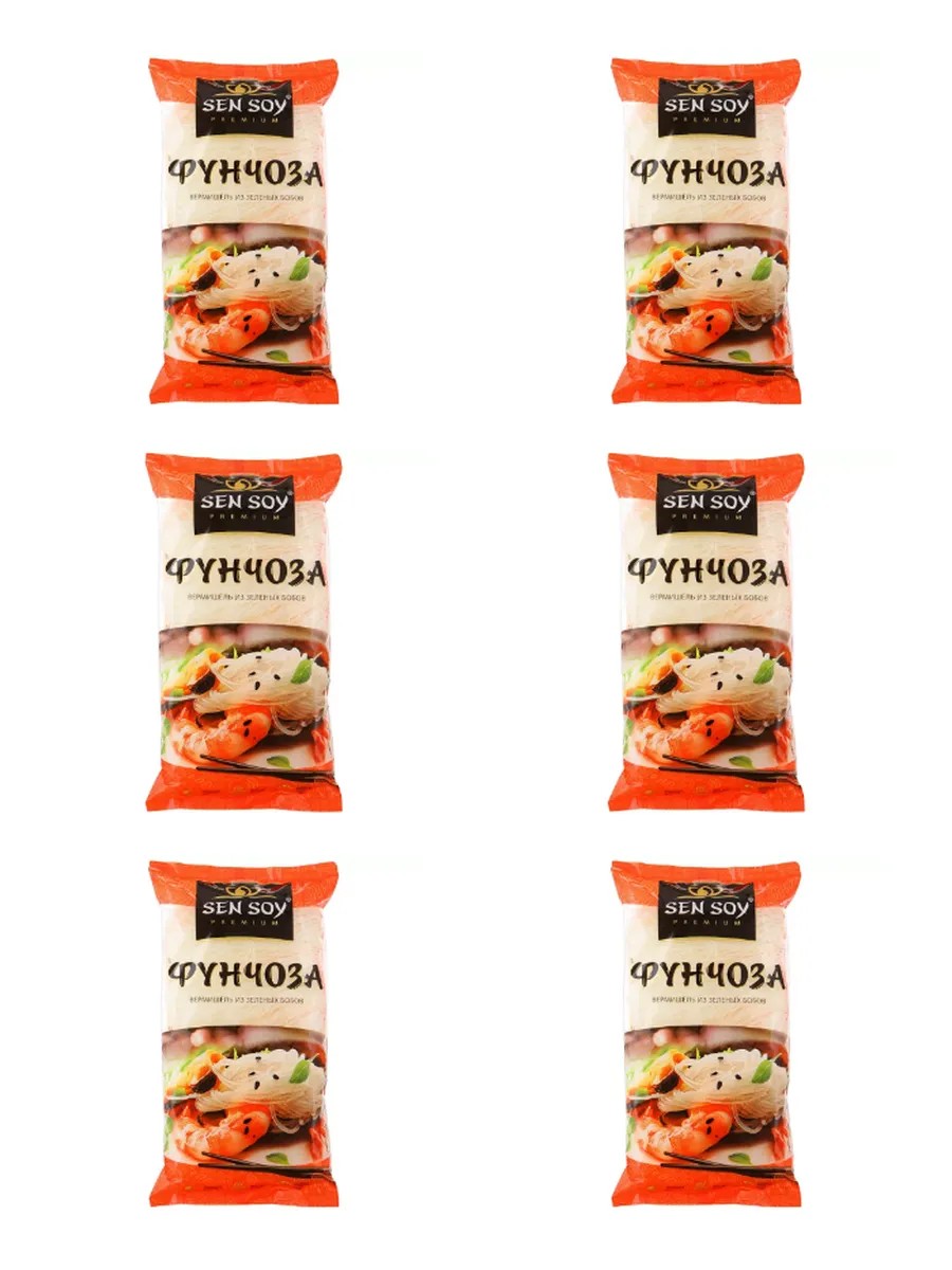 Sen Soy Вермишель Фунчоза, 200 г, 6 шт. Фунчоза – это вермишель из бобовой муки. Она широко распространена и популярна в Корее, Китае, Японии, Вьетнаме. Бобовая вермишель хорошо сочетается с овощами и мясом в горячих блюдах и супах, а также является основой для знаменитого салата по-корейски Фунчоза. В его состав входят особенно пикантные восточные специи и свежие овощи. Такой салат украсит любой стол – как будничный, так и самый праздничный.
