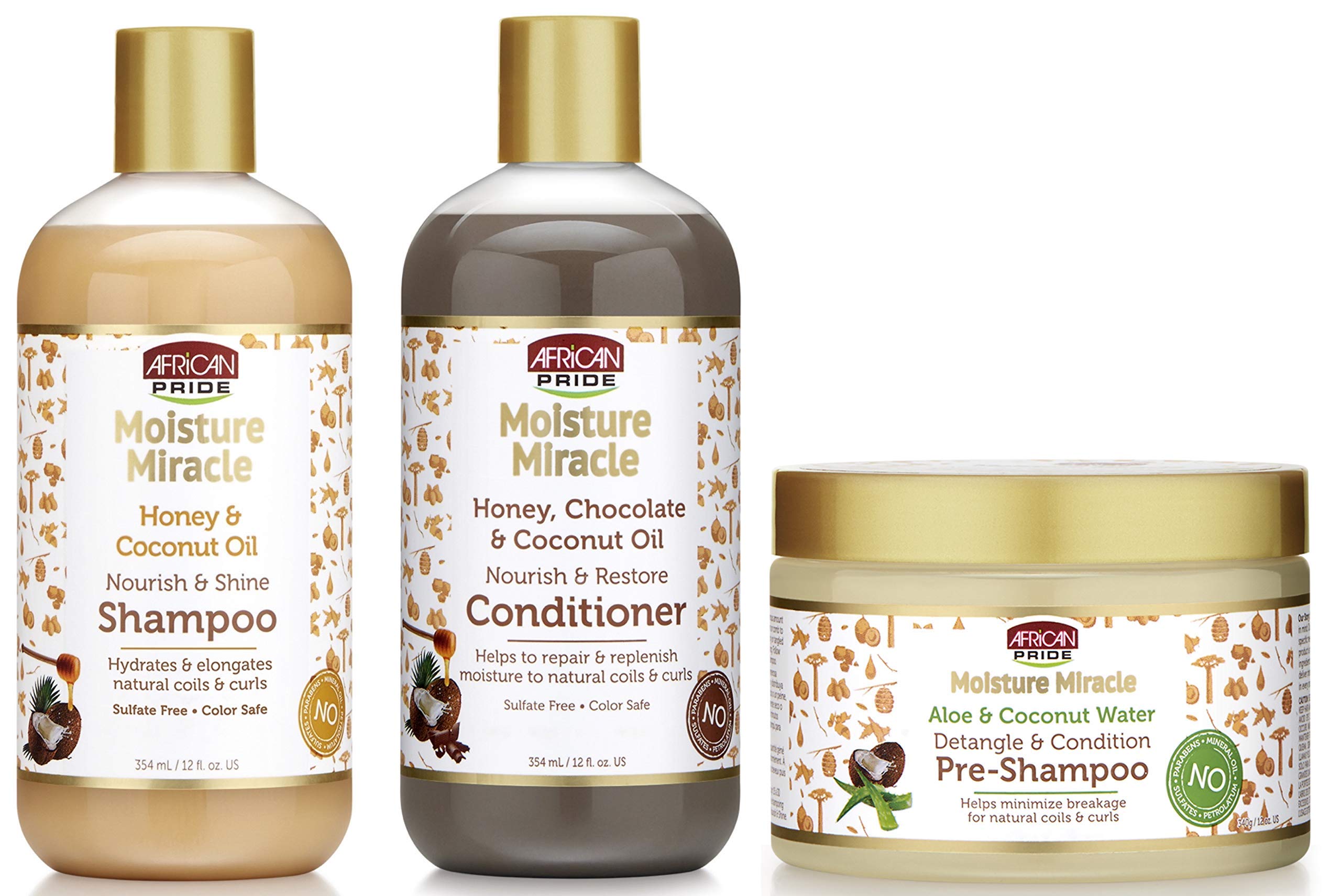 African Pride Moisture Miracle Shampoo and Conditioner is a three-product set that moisturizes and nourishes curly hair. This product contains coconut oil, honey, chocolate, aloe, and coconut water, and is silicone-free. Apply the Moisture Miracle Pre-Shampoo to dry scalp and hair before washing, leave on for a few minutes, then rinse thoroughly. This product is a liquid and comes in a 1.22E 3 gram unit. DIRECTIONS Before shampooing, apply the product to your hair, then follow the steps recommended for your hair type. SAFETY WARNING For external use only. Avoid contact with eyes. Keep away from open flames or direct heat sources. See moreIdeal for curly hair: specific nourishment and hydration for curly and coily hair. Silicone-free: care without harmful chemicals for healthy hair. Easy detangling: pre-shampoo to loosen knots and facilitate styling. Deep hydration: coconut oil, honey, chocolate, aloe, and coconut water for curly hair. Triple-action treatment: pre-shampoo, shampoo, and conditioner in one.African Pride Pré-shampooing démêlant et revitalisant Moisture Miracle, Shampooing et revitalisant de 3, huile de coco, miel, miel, chocolat, huile de noix de coco, eau d'aloès et de noix de cocoDESCRIPTION DU PRODUIT DESCRIPTION DU PRODUIT Le shampooing et après-shampooing African Pride Moisture Miracle est un ensemble de trois produits qui hydratent et nourrissent les cheveux bouclés. Ce produit contient de l'huile de coco, du miel, du chocolat, de l'aloès et de l'eau de coco, et est sans silicone. Appliquez le démêlant et après-shampooing Pre-Shampoo Moisture Miracle sur le cuir chevelu et les cheveux secs avant le lavage, laissez agir quelques minutes, puis rincez abondamment. Ce produit est liquide et est livré dans une unité de 1,22E 3 grammes. MODE D'EMPLOI Avant le shampooing, appliquez le produit sur vos cheveux, puis suivez les étapes recommandées pour votre type de cheveux. AVERTISSEMENT DE SÉCURITÉ Pour usage externe uniquement. Éviter le contact avec les yeux. Tenir à l'écart de toute flamme nue ou source de chaleur directe. Voir plusIdéal pour les cheveux bouclés : nutrition et hydratation spécifiques pour les cheveux bouclés et crépus. Sans silicone : soin sans produits chimiques nocifs pour des cheveux sains. Démêlage facile : pré-shampooing pour défaire les nœuds et faciliter le coiffage. Hydratation profonde : huile de coco, miel, chocolat, aloès et eau de coco pour cheveux bouclés. Traitement triple action : pré-shampooing, shampooing et après-shampoing en un seul ensemble.