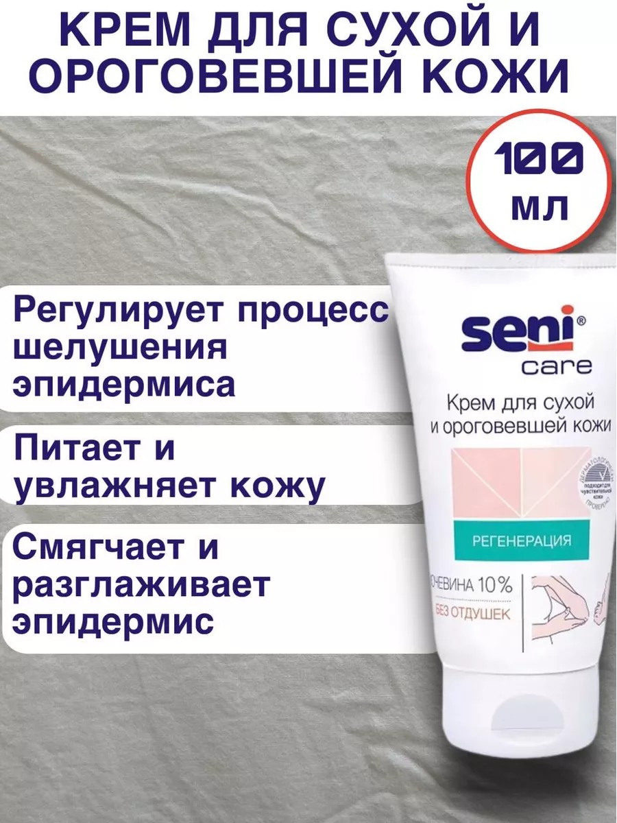 Крем Seni Care для сухой ороговевшей кожи. В местах, где кожа чрезмерно сухая и подвержена ороговению, необходимо интенсивное увлажнение и питание кожи. В таких случаях рекомендуется использовать средства с большей концентрацией мочевины, которая регулирует процесс шелушения и ороговения эпидермиса. Рекомендуется для ежедневного ухода за сухой, подверженной ороговению кожей (колени, локти, ступни).