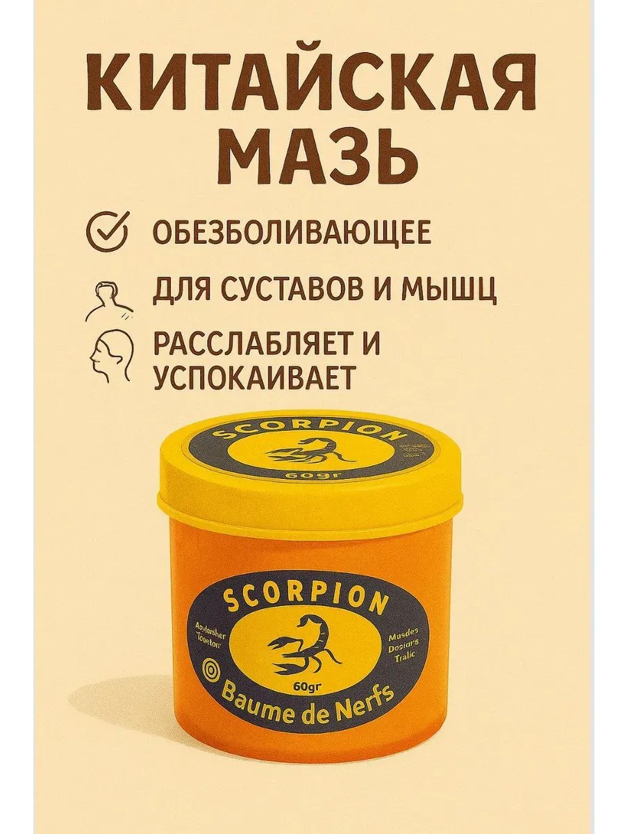 Профессиональная разогревающая мазь на основе экстракта скорпиона и проверенных травяных компонентов для быстрого обезболивания и снятия мышечных и суставных дискомфортов.