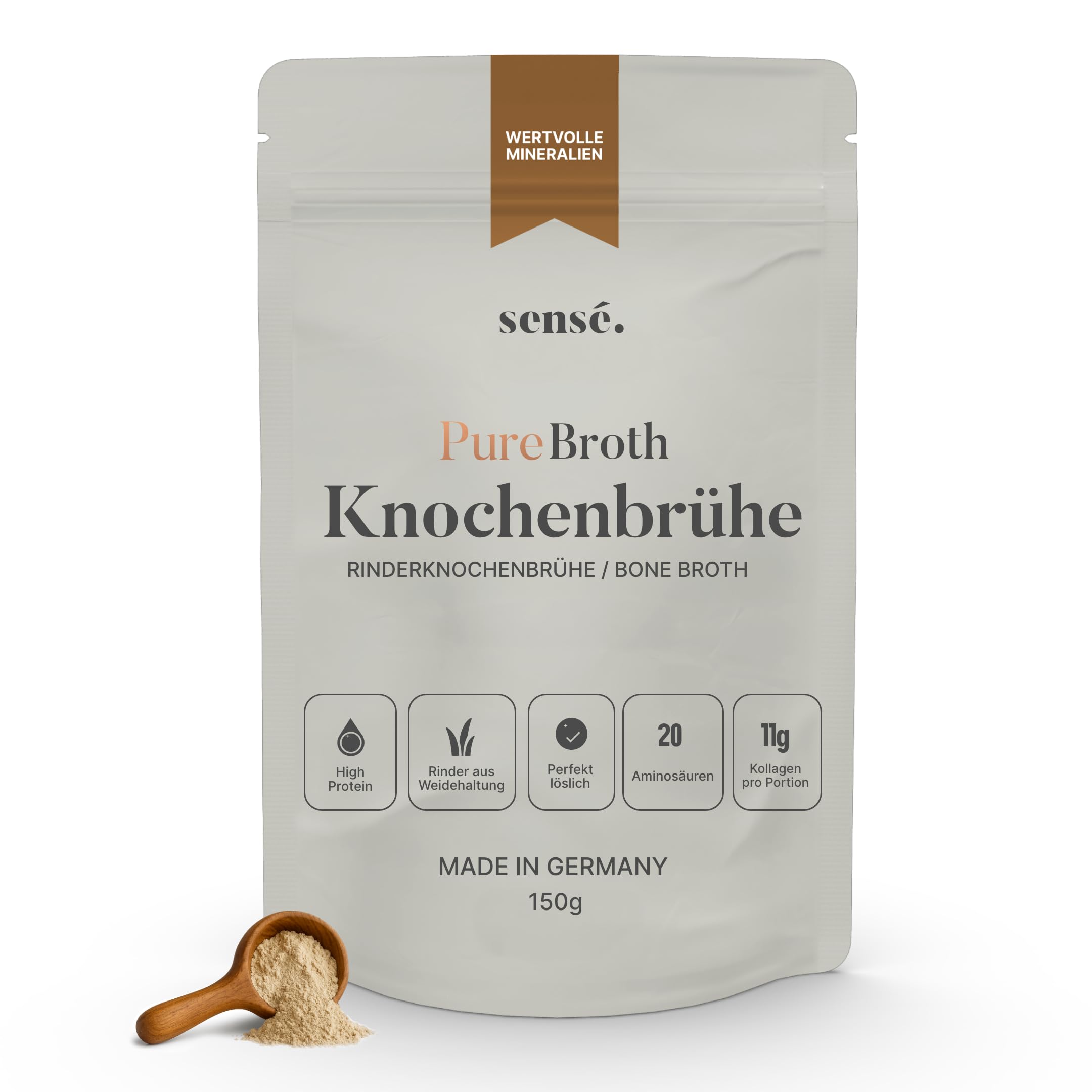 Discover the powerful effect of Pure Beef Bone Broth Powder. This traditionally made beef broth is gently dried to ensure maximum nutrient content and optimal taste. Rich in type I and III collagen, it provides valuable amino acids to support joints, skin, hair, nails, and gut health. Natural collagen for strong joints and beautiful skin. Collagen is the body's most important structural protein and is essential for elastic skin, healthy joints, and strong connective tissue. Our bone broth powder contains bioavailable collagen that is particularly well absorbed by the body. Perfectly soluble and versatile. Thanks to its fine powder form, PureBroth Collagen dissolves effortlessly in hot water – ideal for quick and easy preparation. Use it for: Classic bone broth – simply pour water into soups, sauces, and stews for added flavor and nutrients. Smoothies or instant coffee as a protein booster. Ideal for Keto Paleo – Low in carbs and nutrients – With high protein, zero added sugar, and low carbohydrates, our bone broth powder is the perfect complement to a ketogenic, paleo, or high-protein diet. 100 natural. No artificial flavors, preservatives, or flavor enhancers. Sugar, gluten, and lactose free. Sustainably sourced from premium beef bones. Large 350g pack. Thanks to the economical pack size, PureBroth Collagen is ideal for daily enjoyment and long-term nutritional support. INGREDIENTS Bone Broth (Beef Bone Broth), Sunflower LecithinAlso suitable for pets: Our bone-based bread powder can be confidently given to dogs and cats. Pure bone broth supports joints, digestion, and vitality – with no artificial additives. Versatile and keto-friendly – free from sugar, gluten, and artificial additives – ideal for a healthy, protein-rich diet. Great for children. 15g per serving for maximum nutrient absorption – the optimal amount for an efficient supply of essential amino acids and protein. Perfectly soluble – no more lumps! Use it in hot and cold water, for soups, smoothies, coffee, or as beef broth. Perfectly soluble in all forms. From farm-raised and grass-fed cattle – sustainably sourced EU beef bone broth from species-appropriate farming for superior quality. 11g of collagen per serving: Premium beef collagen in a bone loaf to support joints, skin, and gut health, with types 1, 2, and 3 collagen. Long, original cooking – Our PureBroth is slowly boiled for many hours – just like in the old days. The result is an original, nutrient-rich bone broth made the traditional way – pure, honest, and full of flavor.Poudre de bouillon d'os de vache sauvage bio 150 g – Collagène type 1,2 3 Soutient les articulations, les intestins et la peau Haute teneur en protéines Leaky Gut, Keto, Paleo Sans sel 150gDESCRIPTION DU PRODUIT DESCRIPTION DU PRODUIT Découvrez l'effet puissant de la poudre pure de bouillon d'os de bœuf bouillon de bœuf fabriqué de manière traditionnelle et séchée doucement pour garantir une teneur maximale en nutriments et un goût optimal. Riche en collagène de type I et III, elle fournit des acides aminés précieux pour soutenir les articulations, la peau, les cheveux, les ongles et la santé intestinale. Le collagène naturel pour les articulations fortes et la belle peau Le collagène est la protéine structurelle la plus importante du corps et est essentiel pour une peau élastique, des articulations saines et un tissu conjonctif fort. Notre poudre de bouillon d'os contient du collagène biodisponible qui est particulièrement bien absorbé par le corps. Parfaitement soluble et polyvalent. Grâce à la forme fine en poudre, le sensé. se dissout PureBroth Collagène sans effort dans l'eau chaude - Idéal pour une préparation rapide et facile. Utilisez-le pour : bouillon d'os classique – il suffit de verser de l'eau les soupes, les sauces et les ragoûts pour plus de goût et de nutriments Smoothies ou café étanche comme booster de protéines Idéal pour Keto Paleo – Faible teneur en glucides et nutriments – Avec une teneur élevée en protéines, zéro sucre ajouté et peu de glucides, notre os est poudre de bouillon Le complément parfait pour une alimentation cétogène, paléo ou riche en protéines. 100 naturel Sans arômes artificiels, conservateurs et exhausteurs de goût Sans sucre, gluten et lactose Obtenu durablement à partir d'os de bœuf de qualité supérieure Grand paquet de 350 g Grâce à la taille de l'emballage économique, sensé. est adapté. Le collagène PureBroth est idéal pour un plaisir quotidien et un apport nutritionnel à long terme. INGRÉDIENTS Bouillon d'os (bouillon d'os de bovin), lécithine de tournesolConvient également pour les animaux de compagnie : notre poudre de pain à base d'os peut également être donnée aux chiens et aux chats en toute confiance. Le bouillon d'os pur soutient les articulations, la digestion et la vitalité – sans additifs artificiels. Polyvalentes et respectueuses de la KETO – Sans sucre, gluten et additifs artificiels – Idéales pour une alimentation saine et riche en protéines. Idéal pour les enfants. 15 g par portion pour une absorption maximale des nutriments - Quantité optimale pour un approvisionnement efficace en acides aminés et protéines essentiels. Parfaitement soluble – Enfin plus de grumeaux ! Utilisez-les dans de l'eau chaude et froide, pour les soupes, les smoothies, le café ou comme bouillon de bœuf. Parfaitement soluble dans toutes les formes. À partir de l'élevage et de l'alimentation à l'herbe – Bouillon d'os de bovins provenant de l'UE obtenu de manière durable et élevage adapté aux espèces pour une qualité supérieure. 11 g de collagène par portion : collagène de bœuf de qualité supérieure en pain d'os pour soutenir les articulations, la peau et les intestins, avec les collagènes de types 1, 2 et 3. Cuisson longue durée et originale – Notre PureBroth est bouillie lentement pendant de nombreuses heures – comme avant. Le rés