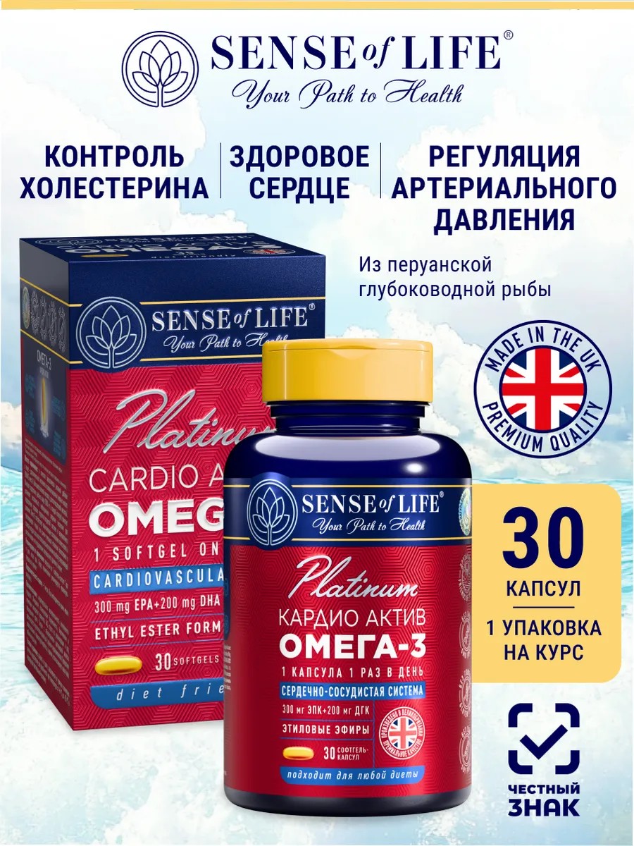 Sense of Life Премиальная Омега 3 кардио актив для сердца и сосудов, 30 шт