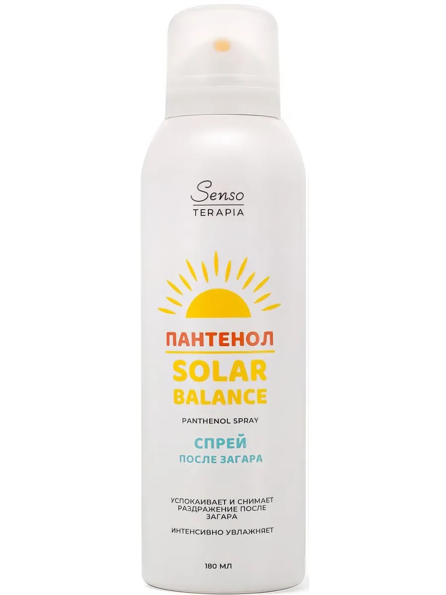 Senso Terapia Solar Balance After-Sun Spray with Panthenol, 180 ml. This after-sun spray actively soothes, softens, and restores the skin, eliminating the negative effects of tanning. Panthenol, which is part of the formula, performs a restorative, moisturizing, and nourishing function, prevents dryness, normalizes the water-lipid balance, relieves irritation, and promotes skin recovery after sunburn. The spray spreads easily and lays on the skin, is well absorbed, quickly soothes, and does not leave a sticky feeling. It has a light foam structure. Volume: 180 ml. Directions for use: 1. Shake before use. 2. Apply generously to the skin, holding it at a distance of no more than 10 cm from the skin. 3. Leave the product on until completely absorbed. 4. Spread the remaining product over the skin or remove it with a napkin. Ingredients: WATER, PANTHENOL, PROPYLENE GLYCOL, PALMITIC ACID, STEARIC ACID, GLYCERIN, GLYCERYL STEARATE, PEG-100 STEARATE, BEHENYL ALCOHOL, CETEARYL ALCOHOL, PHENOXYETHANOL, ETHYLHEXYLGLYCERIN, POTASSIUM HYDROXIDE, TOCOPHERYL ACETATE, CENTELLA ASIATICA EXTRACT, PARFUMPropellant:PROPANE, BUTANE, ISOBUTANE