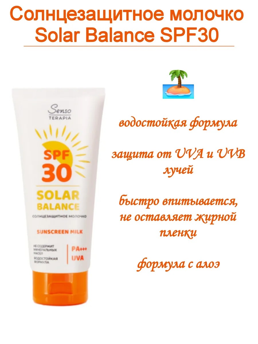 Солнцезащитное молочко SPF 30 Solar Balance, 150мл, бренд Senso Terapia -незаменимое средство во время солнечных дней. Обеспечивает надежную защиту от вредного воздействия ультрафиолетовых лучей, предотвращает солнечные ожоги, пигментацию и преждевременное старение кожи.