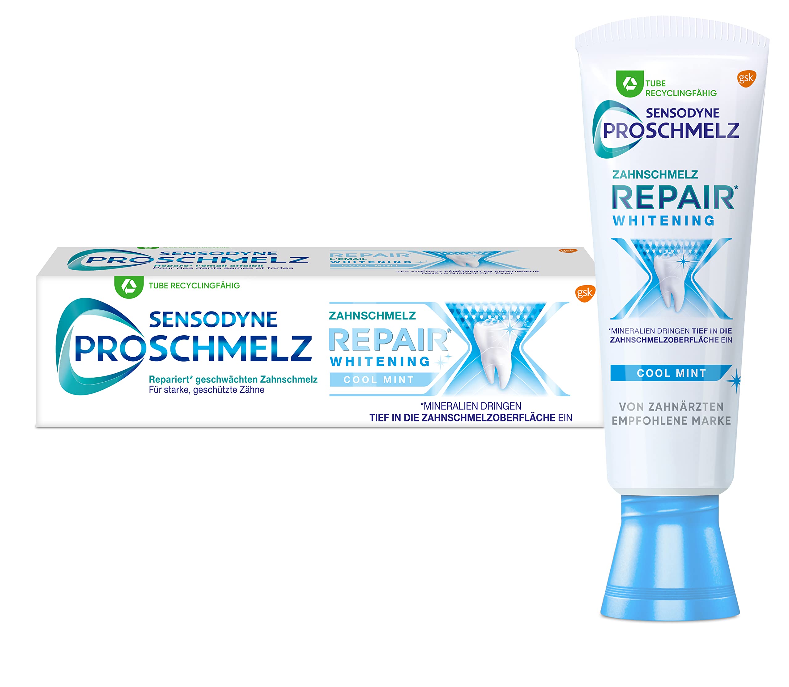 Tooth enamel is the visible, outer layer of our teeth.It represents the essential protective layer of our teeth. Acids in food and drinks can weaken the enamel and to reduce tooth enamel.Over time, the teeth can become thinner and appear more yellowish.Pain sensitivity can also be a result.With the daily use of a specially formulated toothpaste, you can help protect yourself from the consequences of acid -related tooth melting.Sensodyne Proschmelz Repair Whitening toothpaste promotes the absorption of minerals deep into the tooth melt surface to help regenerate weakened tooth enamel - for better protected teeth.With brushing your teeth two daily, Sensodyne Proschmelz Repair Whitening toothpaste helps to regenerate the tooth enamel surface.It delivers minerals to protect against the consequences of acid -related tooth melting breakdown.It also protects against caries and removes discoloration - for naturally white teeth.Sensodyne Proschmelz Repair Whitening toothpaste is also suitable for people with sensitive teeth.So you can enjoy hot and cold things again without worry - and with healthy and less pain -sensitive teeth, you can fully enjoy life.Always follow the instructions for use: brushing your teeth 2x to max. 3 times a day, then spit out, avoid swallowing. Address manufacturer importer Barthstraße 4, 80339 Munichoffers all the advantages of a daily toothpaste.The No. 1 for strong tooth enamel - best -selling brand in Germany - Source: Nielsen Markettrack, toothpaste, erosion (customer -defined segment), paragraph in pack, Germany, Leh DM KWh A, MAT KW17 2020.Helps reduce the pain in sensitive teeth, protects against caries and gives fresh breath.Removed discoloration - for natural white teeth.Helps to regenerate the tooth melt surface with tweaking of teeth twice - for strong and healthy teeth.Zahnschmelz ist die sichtbare, äußere Schicht unserer Zähne. Er stellt die wesentliche Schutzschicht unserer Zähne dar. Säuren in Lebensmitteln und Getränken können den Zahnschmelz schwächen und Zahnschmelzabbau begünstigen. Mit der Zeit können die Zähne dadurch dünner werden und gelblicher erscheinen. Auch Schmerzempfindlichkeit kann eine Folge sein. Durch die tägliche Verwendung einer speziell formulierten Zahnpasta können Sie dazu beitragen, sich vor den Folgen von säurebedingtem Zahnschmelzabbau zu schützen. Sensodyne ProSchmelz Repair Whitening Zahnpasta fördert die Aufnahme von Mineralien tief in die Zahnschmelzoberfläche, um dabei zu helfen, geschwächten Zahnschmelz zu regenerieren - für besser geschützte Zähne. Bei zweimal täglichem Zähneputzen hilft Sensodyne ProSchmelz Repair Whitening Zahnpasta dabei, die Zahnschmelzoberfläche zu regenerieren. Sie liefert Mineralien, um vor den Folgen von säurebedingtem Zahnschmelzabbau zu schützen. Sie schützt zudem vor Karies und entfernt Verfärbungen - für natürlich weissere Zähne. Sensodyne ProSchmelz Repair Whitening Zahncreme ist außerdem für Menschen mit schmerzempfindlichen Zähnen geeignet. So kann man wieder ohne Sorgen Heißes und Kaltes genießen – und mit gesunden und weniger schmerzempfindlichen Zähnen das Leben voll auskosten. Befolgen Sie stets die Anwendungshinweise: 2x bis max. 3x pro Tag Zähneputzen, dann ausspucken, Schlucken vermeiden. ANSCHRIFT HERSTELLER IMPORTEUR Barthstraße 4, 80339 MünchenBietet alle Vorteile einer täglichen Zahncreme. Die Nr. 1 für starken Zahnschmelz - meistverkaufte Marke in Deutschland - Quelle: Nielsen MarketTrack, Zahnpasta, Erosion (kundendefiniertes Segment), Absatz in Pack, Deutschland, LEH DM KWH A, MAT KW17 2020. Hilft den Schmerz bei empfindlichen Zähnen zu reduzieren, schützt vor Karies und gibt frischen Atem. Entfernt Verfärbungen - für natürlich weissere Zähne. Hilft bei 2x täglichem Zähneputzen die Zahnschmelzoberfläche zu regenerieren – für starke und gesunde Zähne.Sensodyne ProSchmelz Repair Whitening Zahnpasta, 75ml, tägliche Zahncreme mit Fluorid, repariert nachweislich durch Säuren geschwächten Zahnschmelz entfernt Verfärbungen. 75 ml (1er Pack)