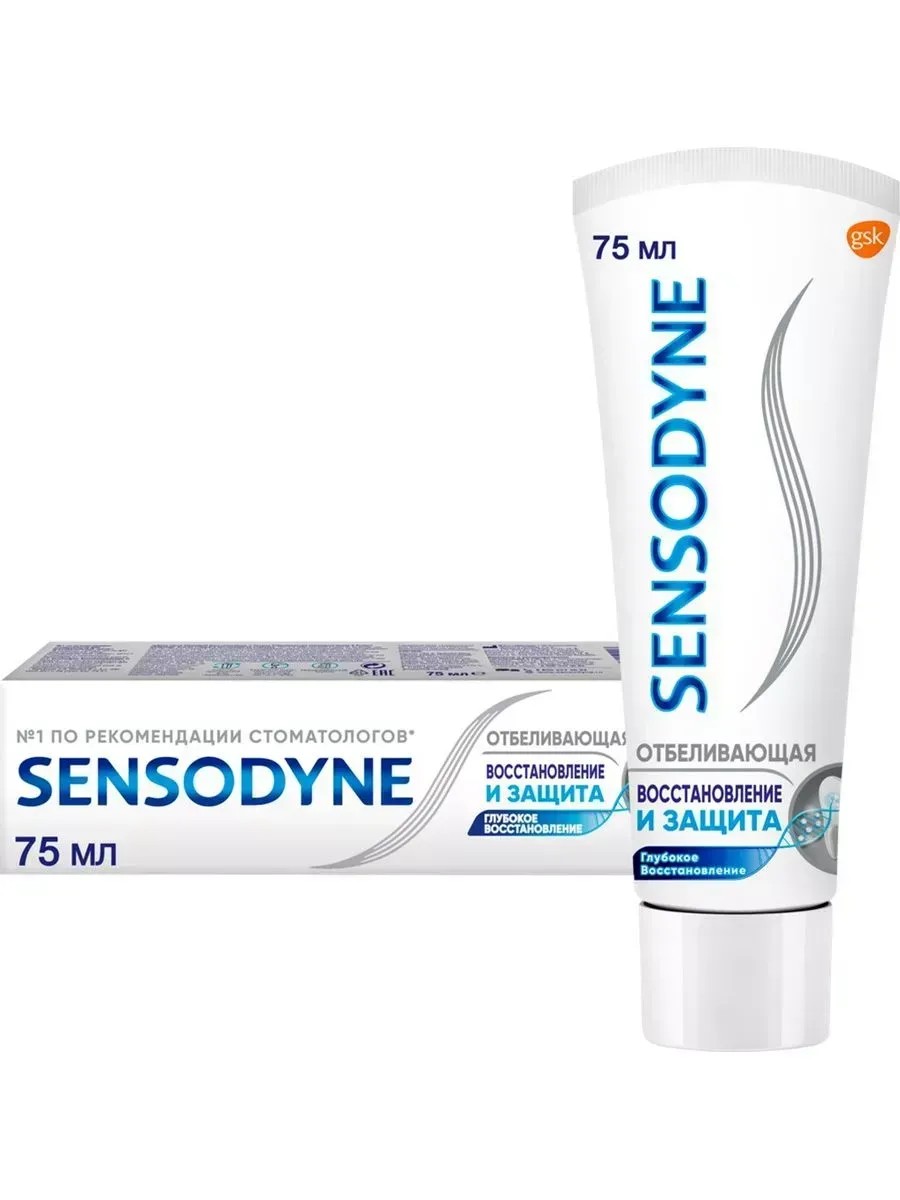 SENSODINE TOOTHPASTE, RESTORE & PROTECT, WHITENING, 75MLSensodyne Restoration & Protection Whitening, toothpaste for sensitive teeth. Sensodyne is the #1 dentist-recommended brand* for sensitive teeth. Exposed dentin is the cause of increased tooth sensitivity. With Sensodyne Restoration & Protection Whitening toothpaste, you can restore normal sensitivity. Sensodyne Restoration & Protection Whitening toothpaste forms a protective layer on the surface of sensitive areas of the teeth, similar in composition to natural tooth enamel. Use Sensodyne Restoration & Protection Whitening toothpaste twice daily to restore and protect teeth from sensitivity. At the same time, Sensodyne Restoration and Protection Whitening toothpaste helps maintain the natural whiteness of teeth**.* "A study of dentists' recommendations for various brands in the oral care segment," GFK-Rus Marketing Research Institute, November 2017 - January 2018.**When brushing twice daily, apply a pea-sized amount of toothpaste to a soft-bristled toothbrush. Brush your teeth twice a day for 1 minute, but no more than three times, or as recommended by your dentist (attention physician). Try to brush all sensitive areas of the teeth more thoroughly. Do not swallow. Spit. If irritation occurs while using the product, discontinue use.