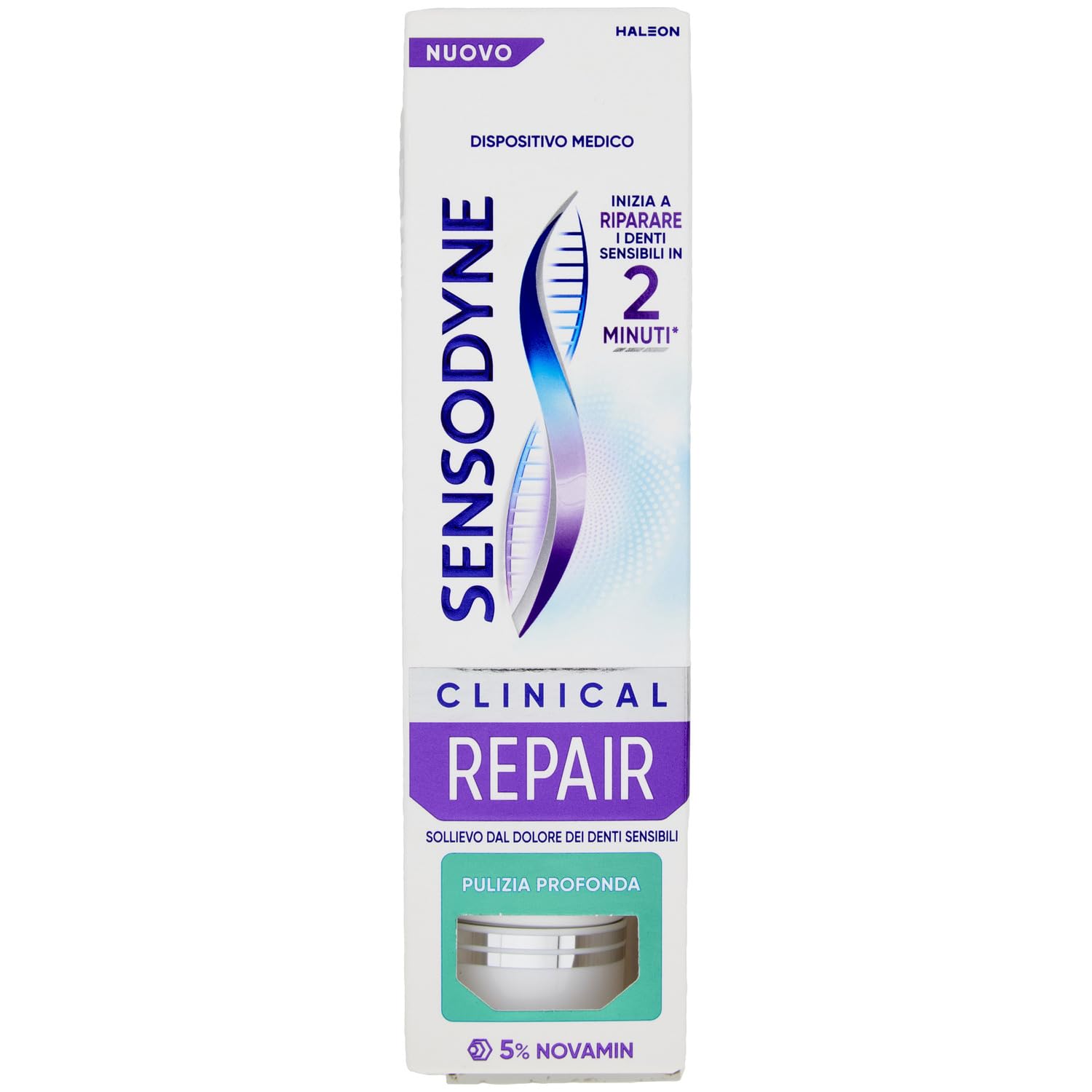 Sensodyne Clinical Repair Deep Clean Toothpaste for sensitive teeth starts to repair sensitive teeth after 2 minutes . For sensitivity relief in 14 days, always follow the package directions. Directions for use: Brush twice a day up to a maximum of three times minimize swallowing and spit out. Close the tube to protect the contents from moisture. Warnings and precautions: Keep out of reach of children. Do not use in children under 12 years of age unless directed by a dentist or doctor. Sensitive teeth may be a sign of underlying problems that require prompt attention. If symptoms persist or worsen, consult your dentist. If irritation occurs, discontinue use of the product. The ends of the kit are sealed. Do not use if the ends of the kit are open. Report any accidents or adverse reactions to the manufacturer, the Ministry of Health, and your pharmacist or dentist. It is important to report product-related incidents, as this can help identify defects in the medical device and prevent similar incidents from recurring. Ingredients: Glycerin, PEG-8, Hydrated Silica, Calcium Sodium Phosphosilicate (NOVAMIN), Perlite, Aroma, Cocamidopropyl Betaine, Sodium Methyl Cocoyl Taurate, Carbomer, Silica, Sodium Fluoride, Sodium Saccharin, CI 74160, CI 74260. Contains sodium fluoride 0.315 w w (1450 ppm fluoride) and NOVAMIN (5 w w). Sensodyne Clinical Repair is a fluoride toothpaste that can be used daily and provides relief for sensitive teeth. Users can report an adverse event to the Haleon toll-free number 800.931.556 or by email to mystory.it haleon.com. Distributor: Haleon Italy S.r.l., Via Monte Rosa 91, 20149 Milan. This is a CE 1639 medical device. Please read the warnings and instructions for use carefully (French not guaranteed). Valid until 24 01 2025. Trademarks of Haleon or its licensors. 2025 Haleon or its licenses PM-IT-SENO-24-00127 INGREDIENTS Glycerin, PEG-8, Hydrated Silica, Calcium Sodium Phosphosilicate (NOVAMIN), Perlite, Aroma, Cocamidopropyl Betaine, Sodium Methyl Cocoyl Taurate, Carbomer, Silica, Sodium Fluoride, Sodium Saccharin, CI 74160, CI 74260. Contains sodium fluoride 0.315 w w (1450 ppm fluoride) and NOVAMIN (5 w w). DIRECTIONS Brush twice a day for three minutes. Minimize swallowing and spitting. Close the tube to protect the contents from moisture. SAFETY WARNING Do not swallow. Close the tube to protect the contents from moisture. If you experience irritation, consult your dentist. See more75 ml, recyclable packaging. "The formula with its Novamin technology works both inside and outside sensitive areas of teeth by releg calcium and phosphate to regenerate the protective layer of sensitive teeth." Offers long-lasting sensitivity relief and helps prevent the return of pain with continuous use twice a day. With superior cleaning action compared to Sensodyne Repair Protect Fresh Mint, in removing surface stains. Protects against the return of sensitivity. Regenerates the lost protective layer of sensitive areas of teeth. Start repairing sensitive teeth in 2 minutes for sensitivity relief in 14 days. Long-lasting sensitivity relief: Sensodyne Clinical Repair toothpaste provides sensitivity relief.Sensodyne Clinical Repair Nettoyage en profondeur, Dentifrice pour dents sensibles, commence à réparer les dents sensibles en 2 minutes , 75 mlDESCRIPTION DU PRODUIT DESCRIPTION DU PRODUIT « Sensodyne Clinical Repair Nettoyage en profondeur, Dentifrice pour dents sensibles, commence à réparer les dents sensibles après 2 minutes , pour un soulagement de la sensibilité en 14 jours, toujours suivre les indications sur l'emballage. Instructions d'utilisation : se brosser les dents deux fois par jour jusqu'à un maximum de trois minimiser l'ingestion et cracher. Fermez le tuyau pour protéger le contenu de l'humidité. Avertissements et précautions : tenir hors de portée des enfants. Ne pas utiliser chez les enfants de moins de 12 ans, sauf indication contraire par le dentiste ou le médecin. Les dents sensibles peuvent être le signal de problèmes sous-jacents qui nécessitent un contrôle rapide, si les symptômes persistent ou s'aggravent, consultez votre dentiste. Si des irritations apparaissent, suspendre l'utilisation du produit. Les extrémités de la trousse sont scellées. Ne pas utiliser si les extrémités de la trousse sont ouvertes. Signaler tout accident ou effet indésirable du produit au fabricant, au ministère de la Santé et au pharmacien ou au dentiste. Il est important de signaler les accidents liés au produit, car cela peut aider à identifier les défauts du dispositif médical et à éviter la répétition d'accidents similaires. Ingrédients : Glycerin, PEG-8, Hydrated Silica, Calcium Sodium Phosphosilicate (NOVAMIN), Perlite, Arôme, Cocamidopropyl Betaine, Sodium Methyl Cocoyl Taurate, Carbomer, Silica, Sodium Fluoride, Sodium Saccharin, CI 74160, CI 74260. Contient du fluorure de sodium 0,315 p p (1450 ppm fluorure) et NOVAMIN (5 p p). Appareil médical Sensodyne Clinical Repair est un dentifrice au fluor qui peut être utilisé tous les jours et qui offre un soulagement des dents sensibles. L'utilisateur peut signaler un événement défavorable au numéro vert Haleon 800.931.556 ou à l'e-mail : mystory.it haleon.com. Distributeur : Haleon Italy S.r.l., Via Monte Rosa 91, 20149 Milano. C'est un dispositif médical CE 1639. Veuillez lire attentivement les avertissements et les instructions d'utilisation (français non garanti). Aut Min du 24 01 2025 Marques de Haleon ou ses licences de licence. 2025 Haleon ou ses licences PM-IT-SENO-24-00127" INGRÉDIENTS Glycerin, PEG-8, Hydrated Silica, Calcium Sodium Phosphosilicate (NOVAMIN), Perlite, Aroma, Cocamidopropyl Betaine, Sodium Methyl Cocoyl Taurate, Carbomer, Silica, Sodium Fluoride, Sodium Saccharin, CI 74160, CI 74260. Contient du fluorure de sodium 0,315 p p (1450 ppm fluorure) et NOVAMIN (5 p p). MODE D'EMPLOI Brossez-vous les dents deux fois par jour pendant trois minutes. Minimisez l'inges