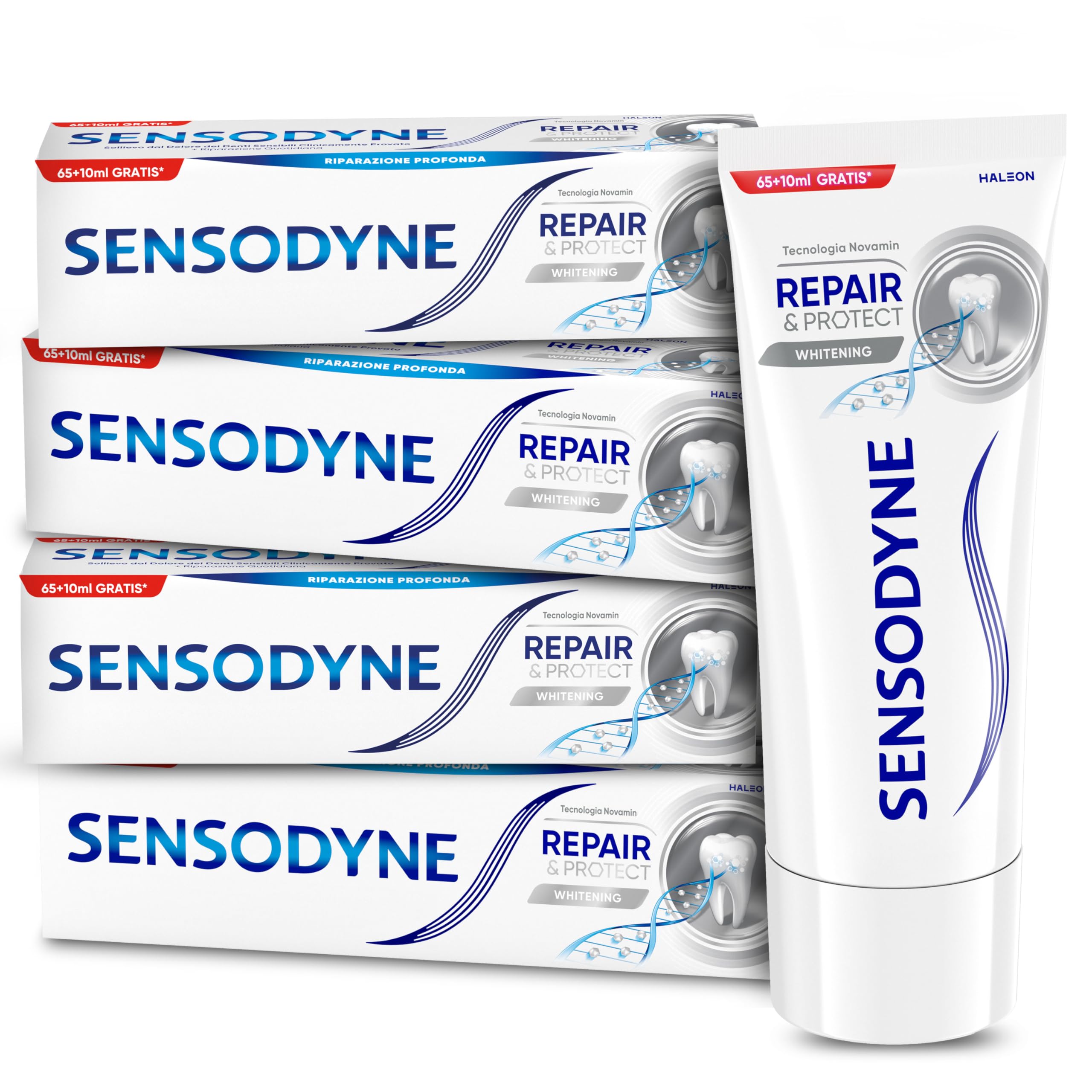 Sensodyne Repair Protect is a fluoride toothpaste that can be used daily to relieve sensitive teeth and help keep your teeth and gums healthy. When used twice daily, Sensodyne Repair Protect has a calcium-based formula with NOVAMIN technology. It helps repair sensitive areas of the teeth deep down by producing the same substances found in teeth. It relieves tooth sensitivity so you can enjoy every moment without worrying about sensitive teeth. It also helps restore the natural whiteness of your teeth and prevent stains. Ingredients: Glycerin, PEG-8, Hydrated Silica, Calcium Phosphosilicate (NOVAMIN), Cocamidopropyl Betaine, Sodium Methyl Cocoyl Taurate, Flavor, Titanium Dioxide, Carbomer, Silica, Sodium Saccharin, Sodium Fluoride, Limonene. Contains sodium fluoride 0.315 w w (fluoride 1450 ppm) and novamine (5 w w). Always follow the package directions. Directions: Brush your teeth twice a day up to a maximum of three times. Minimize swallowing and spitting. Close the tube to protect the contents from moisture. Warnings and precautions: Keep out of reach of children. Do not use in children under 12 years of age unless directed by your dentist or doctor. Sensitive teeth may be a sign of underlying problems that require timely checkups. If symptoms persist or worsen, consult your dentist. If irritation occurs, use the product. The ends of the pouch are sealed. Do not use when the pouch ends are open. The user can report an incident to the Haleono toll-free number in the email. Medical device CE 1639. Read the warnings and instructions carefully (French not guaranteed). Auth Min dated 21.05.2024. Trademarks of Haleon or its licensors. 2024 Haleon or its licensors. PM-IT-SENO-24-00015. To relieve sensitivity and clean teeth and gums, we recommend brushing twice a day with Sensodyne toothpaste and a soft or extra-soft bristle toothbrush, such as: Sensodyne Gentle, Sensodyne Fresh Cleaning, Sensodyne Repair Protect, Sensodyne Sensitivity Gum. Keep out of reach of children. Sensitive teeth can be a sign of underlying problems that require prompt attention. If your symptoms persist or worsen, consult your dentist. Not suitable for children under 12 years of age, unless specifically directed by a dentist or doctor. If irritation occurs, use the product. Contact your dentist or doctor as soon as possible if you experience swelling in your mouth or face. DIRECTIONS Use twice daily for long-lasting relief and protection from tooth sensitivity. SAFETY WARNING Not suitable for children under 12 years of age, unless otherwise advised by a dentist or doctor. For external use only. Do not swallow. Keep out of reach of children. See morePack of 4 x 75ml - Fresh Mint Flavor - Recycled and recyclable cardboard - Recyclable tube and lid. Relieves tooth sensitivity and helps keep your teeth and gums healthy. Thanks to its Novamin technology, it helps deeply repair sensitive areas of teeth. Relieves the pain of sensitive teeth. Sensodyne Repair Protect Whitening is a daily fluoride toothpaste that provides deep tooth repair and a whitening effect, helping to remove surface stains and restore the natural whiteness of your teeth.Sensodyne Repair Protect Blanchiment Dents Sensibles, Usage Quotidien, Paquet de 4 x 75 mlDESCRIPTION DU PRODUIT DESCRIPTION DU PRODUIT Sensodyne Repair Protect est un dentifrice au fluorure qui peut être utilisé quotidiennement et soulage les dents sensibles et aide à garder vos dents et gencives en bonne santé. Utilisé deux fois par jour, Sensodyne Repair Protect a une formule à base de calcium avec sa technologie NOVAMIN. Il aide à réparer les zones sensibles des dents en profondeur en produisant les mêmes substances que celles-ci. Soulage la sensibilité des dents pour que vous puissiez profiter de chaque instant sans vous soucier des dents sensibles. Il aide également à restaurer la blancheur naturelle de vos dents et à prévenir les taches. Ingrédients : glycérine, PEG-8, silice hydratée, phosphosilicate de calcium (NOVAMIN), cocamidopropyl bétaine, sodium méthyl cocoyl taurate, arôme, dioxyde de titane, carbomer, silica, saccharine de sodium, fluorure de sodium, limonène. Contient du fluorure de sodium 0,315 w p (fluorure 1450 ppm) et de la novamine (5 w p). Toujours suivre les instructions sur l'emballage. Mode d'emploi : brossez-vous les dents deux fois par jour jusqu'à trois maximum, minimisez l'ingestion et les crachats. Fermez le tube pour protéger le contenu de l'humidité. Avertissements et précautions d'emploi : tenir hors de portée des enfants. Ne pas utiliser chez les enfants de moins de 12 ans, sauf indication contraire de votre dentiste ou de votre médecin. Les dents sensibles peuvent être le signe de problèmes sous-jacents qui nécessitent un contrôle opportun si les symptômes persistent ou s'aggravent pour consulter votre dentiste. Si des irritations apparaissent, utilisez le produit. Les extrémités de l'étui sont scellées. Ne pas utiliser lorsque les extrémités du sac sont ouvertes. L'utilisateur peut signaler un événement contre le numéro vert Haleono dans l'e-mail. Dispositif médical CE 1639. Lisez attentivement les avertissements et les instructions (français non garanti). Aut Min du 21.05.2024.Marques de Haleon ou ses concédants de licence. 2024 Haleon ou ses concédants de licence. PM-IT-SENO-24-00015 Pour soulager la sensibilité et le nettoyage des dents et des gencives, nous vous recommandons de vous laver les dents deux fois par jour avec un dentifrice Sensodyne et une brosse à dents à poils souples ou extra doux, tels que : Sensodyne Gentle, Sensodyne Fresh Cleaning, Sensodyne Repair Protect, Sensodyne Sensibilité Gencive. Tenir hors de portée des enfants. Les dents sensibles peuvent être le signe de problèmes sous-jacents nécessitant un contrôle rapide. Si vos symptômes persistent ou s'aggravent, consultez votre dentiste. Ne convient pas aux enfants de moins de 12 ans, sauf indication contraire du dentiste 