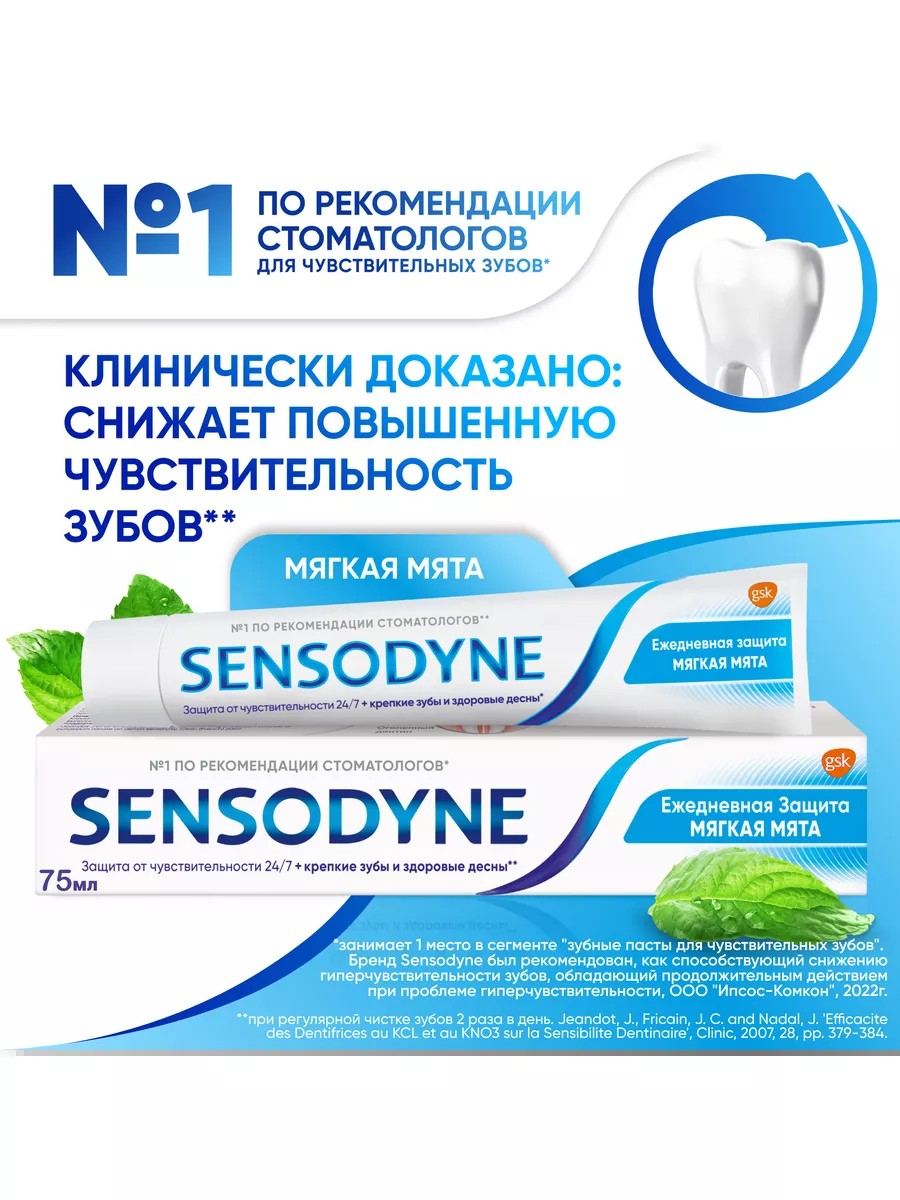 Зубная паста для чувствительных зубов с фтором Sensodyne "Ежедневная защита" — надежный барьер против чувствительности зубов. Зубные пасты Sensodyne помогают обеспечивать длительную защиту чувствительных зубов для снижения болезненных ощущений, вызванных повышенной чувствительностью зубов, а также способствуют профилактике кариеса и свежести вашего дыхания.