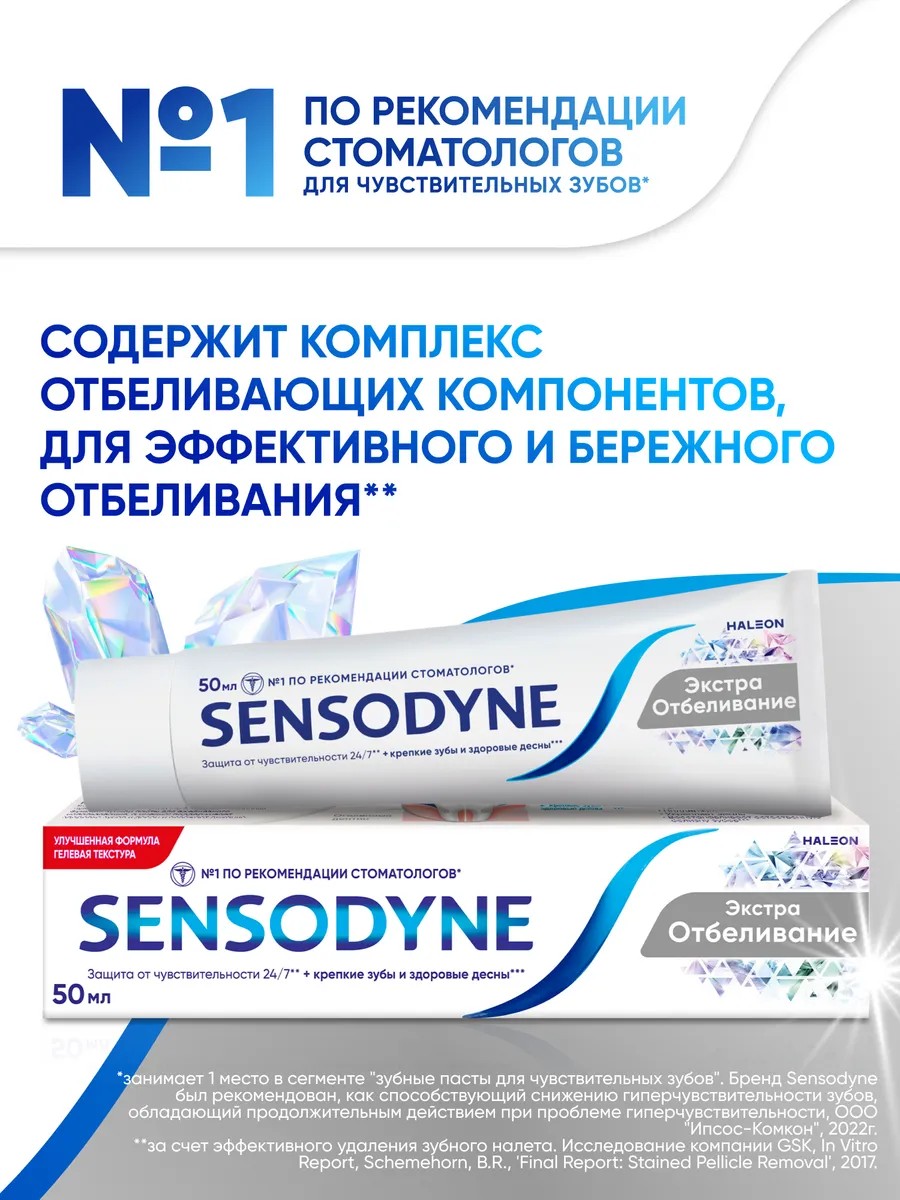Не дайте чувствительности зубов нарушить ваши планы - зубные пасты Sensodyne помогают наслаждаться горячей и холодной едой, которую вы так любите! Зубные пасты Sensodyne помогают снижать болезненные ощущения, вызванные повышенной чувствительностью зубов 1,2, а также способствуют профилактике кариеса 1,3 и свежести вашего дыхания. Позаботьтесь о здоровье полости рта вместе с зубной пастой Sensodyne Экстра Отбеливание.Зубная паста Sensodyne Экстра Отбеливание: - Помогает восстановить естественную белизну зубов 4- Освежает дыхание- Имеет индекс абразивности (RDA) 105. Используйте в комплекте с любой зубной щеткой Sensodyne. 1. При использовании 2 раза в день. 2. Jeandot J et al. Efficacy of toothpastes containing potassium chloride or potassium nitrate on dentin sensitivity. Clinic (French) 2007. 3. Благодаря содержанию фтора 4. Исследование GSK, PCR-17-174, In Vitro Report, Schemehorn, B.R., 'Final Report: Stained Pellicle Removal Study Number PCR-17-174-R', 2017.