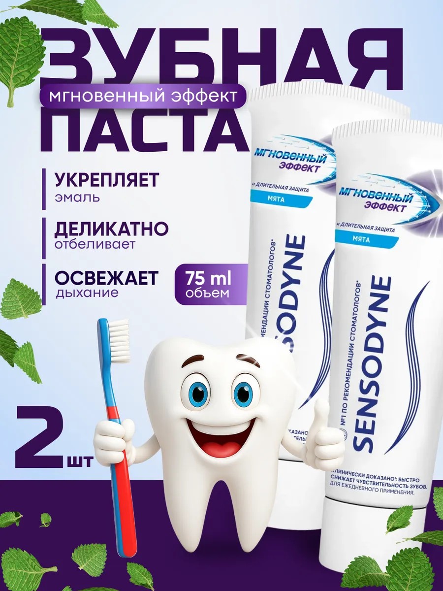 Набор зубных паст состоящий из 2 штук Sensodyne Мгновенный эффект способствует укреплению эмали, деликатно очищает, снижает чувствительность и освежает дыхание. Забота о здоровье всегда начинается с гигиены полости рта. Потому что только при здоровых зубах можно гарантировать здоровье всего организма. Зубная паста подходит для брекетов, она не вызывает аллергии, дискомфорта. Универсальное средство, которое позволяет решить сразу несколько проблем: борьба с кариесом, налетом, чувствительностью десен, все это решается за пару применений. Поэтому, обязательно стоит использовать эту пасту, как настоящий профессиональный уход. Отбеливающая зубная паста включает в себя идеальный состав, который создавался с помощью инновационных технологий. Зубная паста натуральная и отлично подходит для подростков и взрослых, не занимает много места среди других средств в ванной комнате.