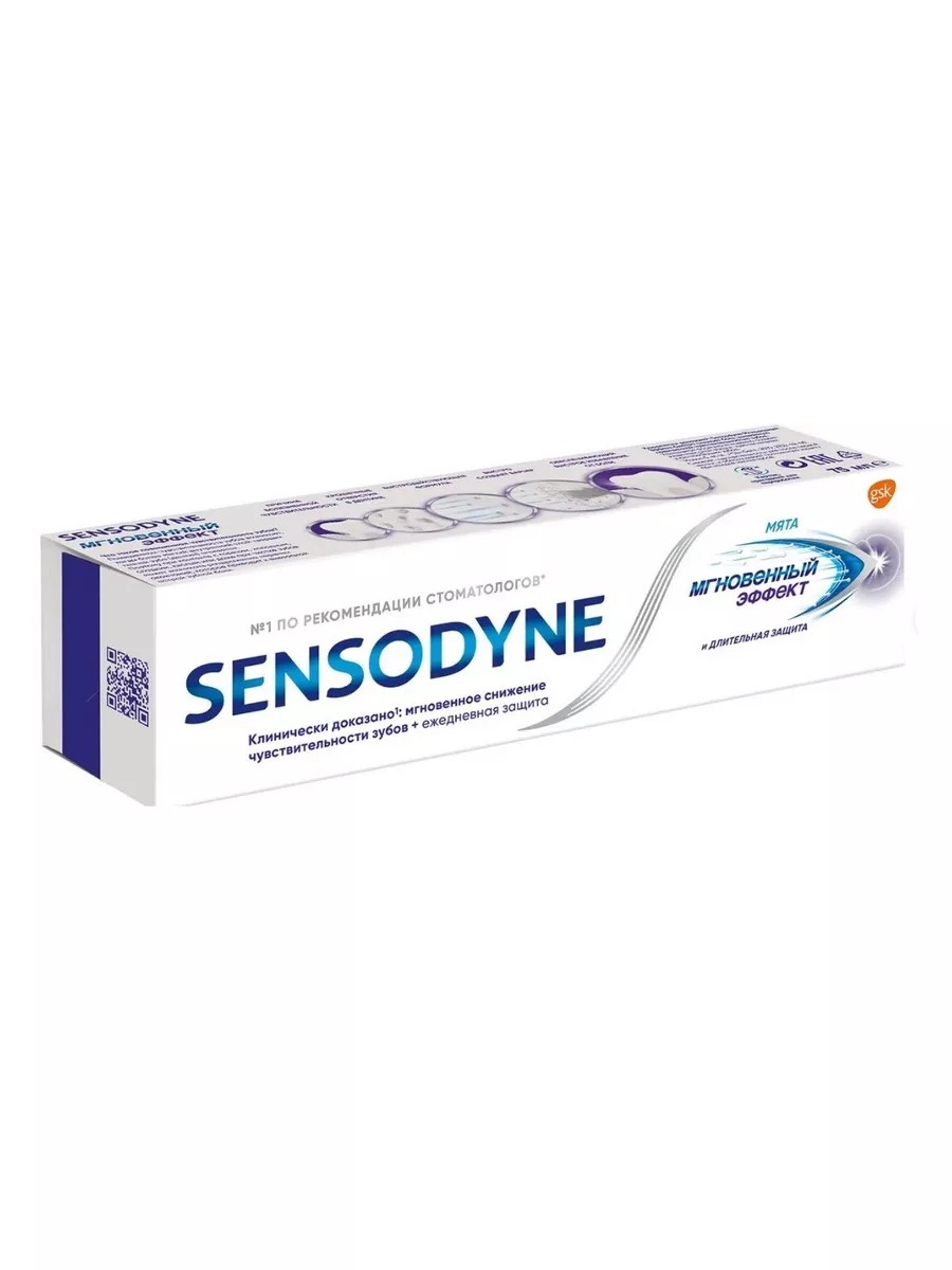 Зубная паста Sensodyne Мгновенный эффект для чувствительных зубов с фтором 75 мл. Зубная паста обеспечивает мгновенное и продолжительное снижение боли при гиперчувствительности зубов, а также создает изолирующий слой на поверхности дентина и внутри дентинных канальцев. Эффект заметен уже через 60 секунд после нанесения. В составе присутствует фтор, способствующий профилактике кариеса. Рекомендуется взрослым и детям с 14 лет.