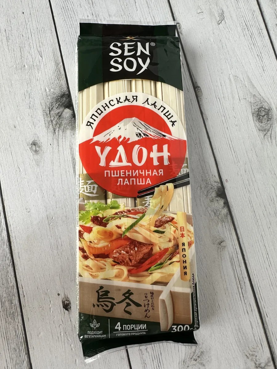 Удон лапша пшеничная Линейка популярных видов японской лапши от SEN SOY готовится из особенно качественных ингредиентов с соблюдением древних традиций, поэтому она весьма питательна и полезна для здоровья. Крупная, толстая и плоская лапша Udon от Sen Soy очень вкусна в супе мисо, а также в поджаренном виде и в качестве гарнира к сашими. Подается, как холодной, так и горячей. Идеально подходит для обжаривания и приготовления блюд в сковороде WOK. Лапша - один из основных компонентов японской кухни, столь популярной сегодня во всем мире. Японская лапша готовится из особенно качественной муки с соблюдением древних традиций, поэтому она весьма питательна и полезна для здоровья. Крупная, толстая и плоская лапша Udon очень вкусна в супе мисо, а также в поджаренном виде в качестве гарнира к сашими, подается как холодной, так и горячей. Японцы считают, что в холодном виде эта лапша освежает в жаркую погоду, а в холодное время лучше всего согреет и насытит горячая лапша Udon. В японской кухне лапша Udon чаще всего используется для приготовления горячего первого блюда. Существует множество рецептов супа с лапшой по-японски. В суп можно добавлять различные овощи, грибы и травы, а бульон готовить с добавлением пасты мисо, рисового уксуса или соевого соуса. Нежная широкая лапша гармонично дополняет ароматный бульон, и придает неповторимый вкус этому традиционному японскому блюду.