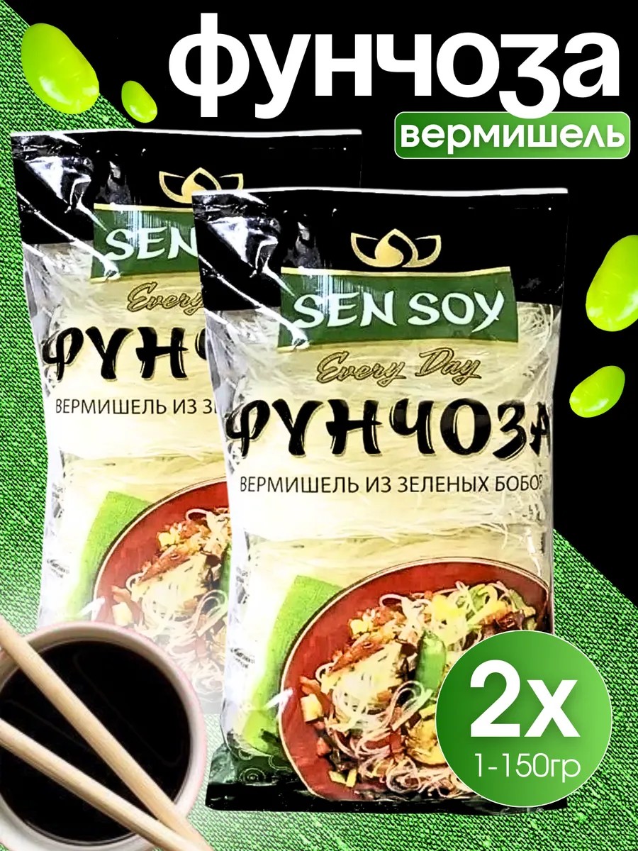 Фунчоза Сенсой из зеленых бобов - это премиальная стеклянная, из зеленых бобов лапша быстрого приготовления. Ее по достоинству оценят ценители макарон и вермишели. Фунчоза Sen Soy легкая в приготовлении. Лапша не содержит глютена и отлично подойдет для людей с непереносимостью глютена, а также для диетического питания и для вегетарианцев, ее можно есть в Пост. Стеклянная Фунчоза сен сой имеет легкий вкус и прекрасно сочетается с мясом, курицей, рыбой, морепродуктами, овощами, а также ее можно добавлять в салат и сочетать с разничными соусами. Вермишель Фунчоза не требует варки, достаточно просто опустить ее в горячую воду и подождать 10 минут. Бобовая стеклянная вермишель подойдет в качестве гарнира к блюдам азиатской кухни.