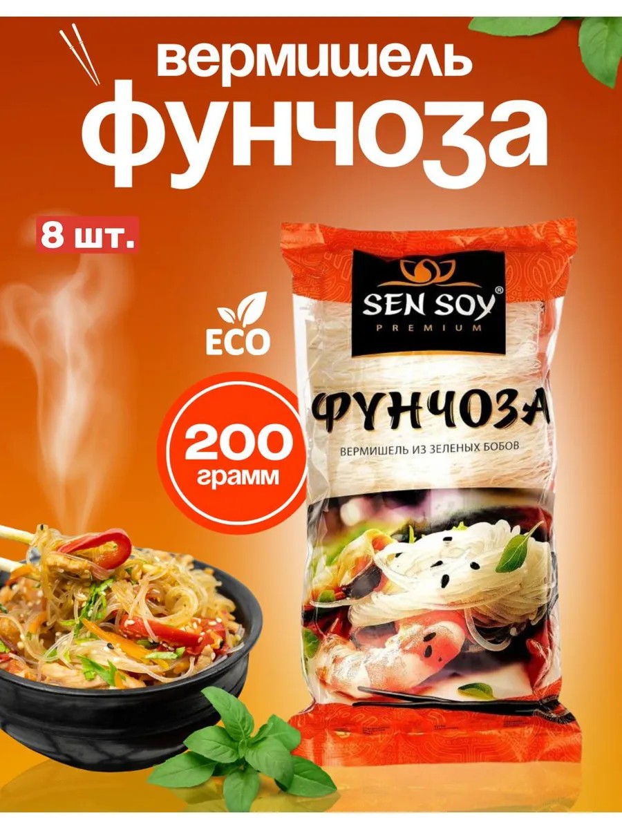 Фунчоза Сенсой из зеленых бобов - это премиальная стеклянная, из зеленых бобов лапша быстрого приготовления. Ее по достоинству оценят ценители макарон и вермишели. Фунчоза Sen Soy легкая в приготовлении. Лапша не содержит глютена и отлично подойдет для людей с непереносимостью глютена, а также для диетического питания и для вегетарианцев, ее можно есть в Пост. Стеклянная Фунчоза сен сой имеет легкий вкус и прекрасно сочетается с мясом, курицей, рыбой, морепродуктами, овощами, а также ее можно добавлять в салат и сочетать с разничными соусами. Вермишель Фунчоза не требует варки, достаточно просто опустить ее в горячую воду и подождать 10 минут. Бобовая стеклянная вермишель подойдет в качестве гарнира к блюдам азиатской кухни.