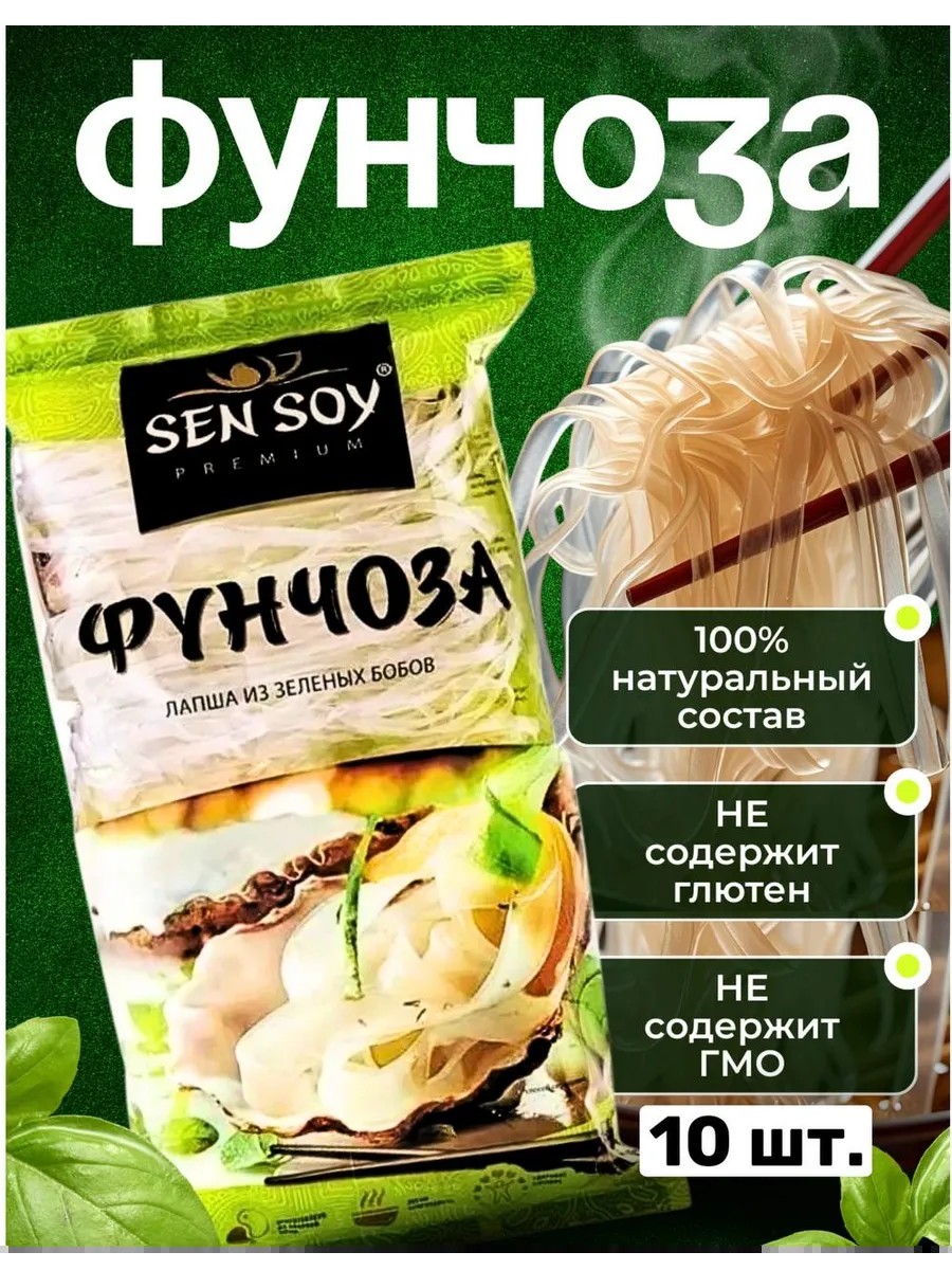 Фунчоза Сенсой из зеленых бобов - это премиальная стеклянная, из зеленых бобов лапша быстрого приготовления. Ее по достоинству оценят ценители макарон и вермишели. Фунчоза Sen Soy легкая в приготовлении. Лапша не содержит глютена и отлично подойдет для людей с непереносимостью глютена, а также для диетического питания и для вегетарианцев, ее можно есть в Пост. Стеклянная Фунчоза сен сой имеет легкий вкус и прекрасно сочетается с мясом, курицей, рыбой, морепродуктами, овощами, а также ее можно добавлять в салат и сочетать с разничными соусами. Вермишель Фунчоза не требует варки, достаточно просто опустить ее в горячую воду и подождать 10 минут. Бобовая стеклянная вермишель подойдет в качестве гарнира к блюдам азиатской кухни.