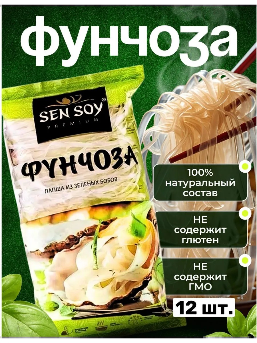 Фунчоза Сенсой из зеленых бобов - это премиальная стеклянная, из зеленых бобов лапша быстрого приготовления. Ее по достоинству оценят ценители макарон и вермишели. Фунчоза Sen Soy легкая в приготовлении. Лапша не содержит глютена и отлично подойдет для людей с непереносимостью глютена, а также для диетического питания и для вегетарианцев, ее можно есть в Пост. Стеклянная Фунчоза сен сой имеет легкий вкус и прекрасно сочетается с мясом, курицей, рыбой, морепродуктами, овощами, а также ее можно добавлять в салат и сочетать с разничными соусами. Вермишель Фунчоза не требует варки, достаточно просто опустить ее в горячую воду и подождать 10 минут. Бобовая стеклянная вермишель подойдет в качестве гарнира к блюдам азиатской кухни.