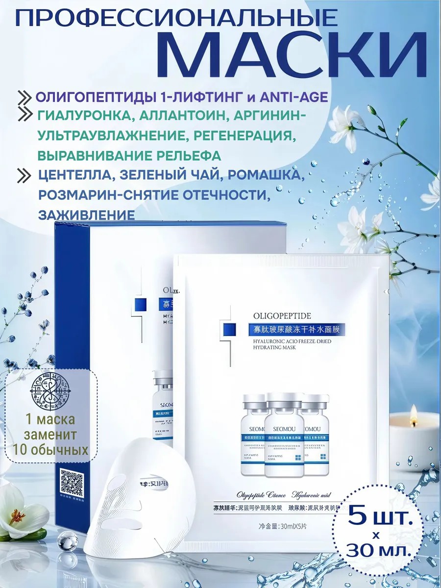A set of 5 sheet masks (30 ml) in a beautiful box with oligopeptides and hyaluronic acid is designed for deep hydration, nourishment, and restoration of facial skin. Each mask is infused with a unique formula containing powerful ingredients such as peptides, hyaluronic acid, arginine, and allantoin.