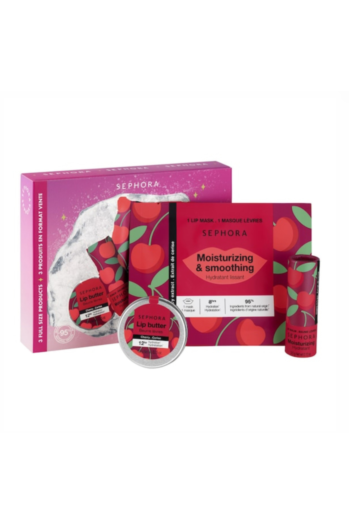 Your lips deserve the best. Get irresistible lips with this SEPHORA COLLECTION lip care kit. This selection of products formulated with cherry extract provides long-lasting moisturization and comfort. Thanks to its cherry scent, this set will be your go-to throughout the winter (and the rest of the year).
