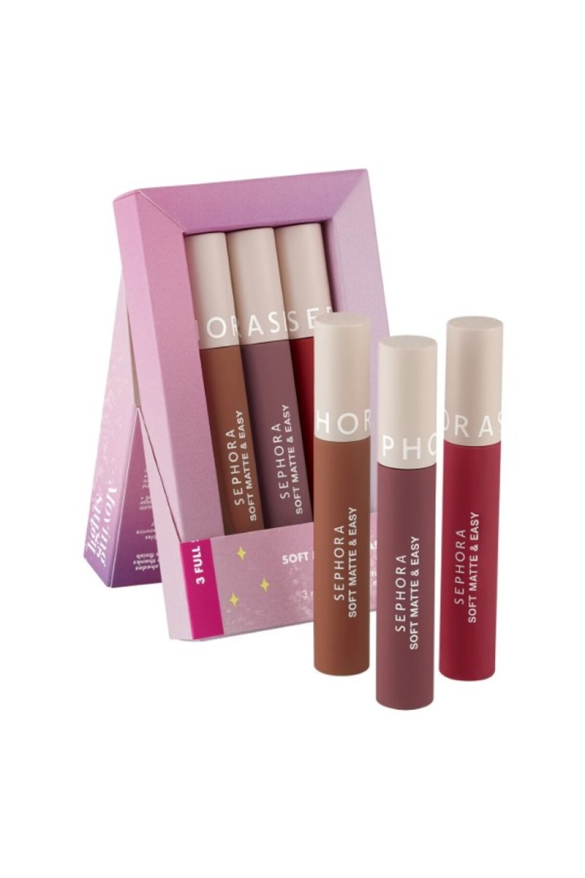 Sahip olunmasi gereken 3 renkte Soft Matte Easy(1) yumusak mat likit rujlardan olusan bir set.