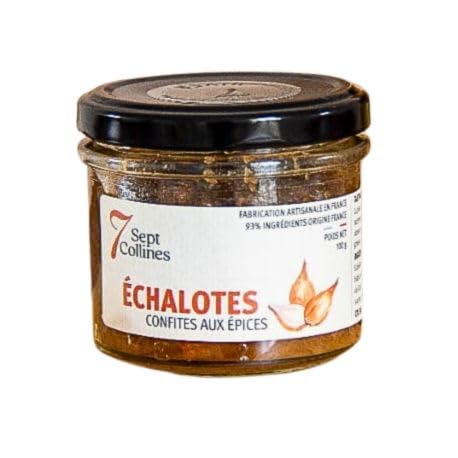 Discover these candied shallots in a spread with oriental flavors, thanks to a perfectly balanced blend of spices. The vegetables are of French origin and are chosen for their exceptional taste. Free from preservatives and additives, this delicious spread is perfect on a slice of bread, perhaps with a slice of foie gras. It will delight lovers of sweet and savory flavors and add a touch of originality to your dishes, surprising your guests with 93 of its ingredients sourced from France. This candied shallot spread is made with the following ingredients: shallots, white wine, raisins, Guérande salt, sunflower oil, cane sugar, a blend of spices, and pepper. The shallots come from the Île-de-France region, specifically the Sarthe or Rhône departments. To select its vegetables, the Sept Collines cannery has partnered with local producers to prioritize short supply chains and guarantee the freshness and quality of its ingredients. The cannery's two managers carefully monitor the quality of vegetable production and maintain direct contact with each producer to examine the produce and develop recipe ideas. Respecting seasonality is also a key selection criterion to preserve the vegetables' flavor. INGREDIENTS Shallots, white wine, raisins, Guérande salt, sunflower oil, cane sugar, spice blend, pepper.Sept Collines - Échalotes Confites Aux Epices 100gDESCRIPTION DU PRODUIT DESCRIPTION DU PRODUIT Découvrez ces échalotes confites dans une tartinade aux saveurs d'Orient, avec un mélange d'épices parfaitement dosé. Les légumes sont d'origine France et sont choisis pour leur qualité gustative. Sans conservateurs ni additifs, cette délicieuse tartinade est à déguster sur une tranche de pain accompagnée d'une tranche de foie gras par exemple. Elle ravira les amateurs de saveurs sucrées salées et apportera une touche d'originalité à vos plats pour surprendre vos invités avec 93 d'ingrédients d'origine France. Cette tartinade d'échalotes confites est élaborée à partir des ingrédients suivants : échalotes, vin blanc, raisins secs, sel de Guérande, huile de tournesol, sucre de canne, mélange d'épices, poivre. Les échalotes proviennent d'Île-de-France de la Sarthe ou du Rhône. Pour choisir les légumes, la conserverie des Sept Collines a établi un partenariat avec des producteurs locaux, afin de privilégier les circuits courts et de garantir la fraîcheur et la qualité des ingrédients. Les deux gérants de la Conserverie scrutent attentivement la qualité de la production de légumes et entrent en contact direct avec chaque producteur pour examiner les produits et concevoir des idées de recettes. Le respect de la saisonnalité fait également partie des critères de sélection des légumes afin de préserver leur goût. INGRÉDIENTS échalotes, vin blanc, raisins secs, sel de Guérande, huile de tournesol, sucre de canne, mélange d'épices, poivre.