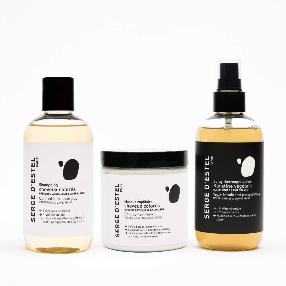 QUI EST SERGE D'ESTEL PARIS ? : C'est LA marque de soins capillaires éco responsables et végans, créés par un coiffeur, fabriqués dans NOTRE laboratoire à Paris. Notre mission ? Penser et Créer des soins capillaires répondant à vos attentes avec des formules douces saines et efficaces. FLACONS EN PLASTIQUE RECYCLÉ : Nous avons opté pour l'utilisation de plastique 100 recyclable dont 50 du plastique est issu des océans. Des formule saines dans un packaging saint. ANTI UV ET PROTECTEUR DE CHALEUR : Grâce à la composition de notre masque et de notre spray thermoprotecteur, vous protégerez votre coloration des rayons UV ainsi que des dommages causées par les sources de chaleur comme : Le lisseur, le sèche-cheveux. PROTÉGEZ ET PROLONGEZ VOTRE COLORATION VÉGÉTALE : Grâce à la formule du shampoing et de notre masque, vous allez pouvoir prolonger la tenue de votre coloration végétale sur vos cheveux. IDÉAL POUR LES COLORATIONS VÉGÉTALES : Nous avons élaboré notre routine de soin pour les cheveux utilisant la coloration végétale. La formulation de nos produits vous permettra de prolongez et protégez votre coloration végétale des agressions extérieures.