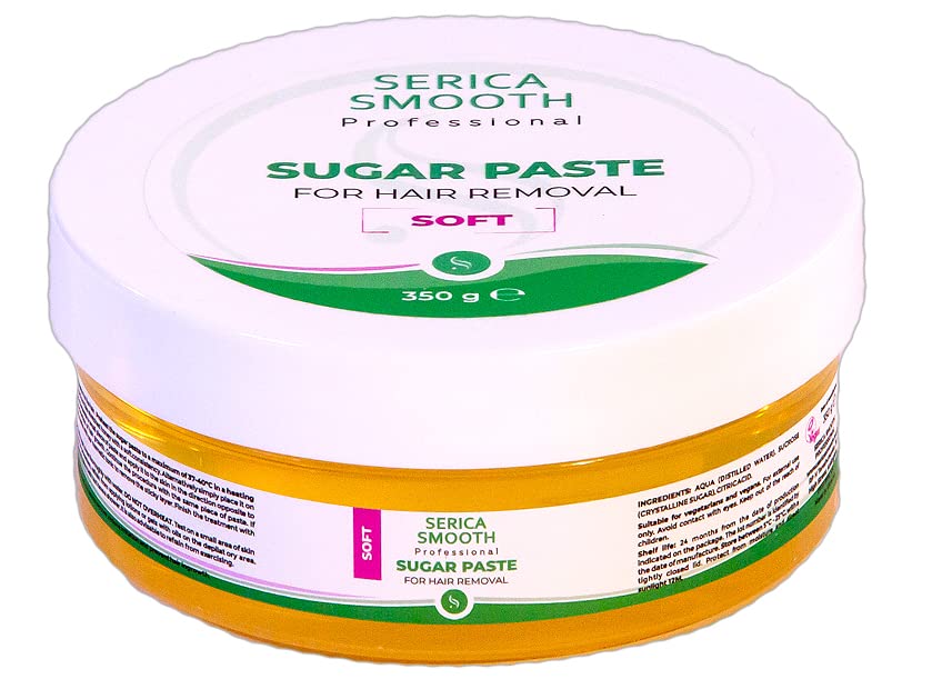 PRODUCT DESCRIPTION SERICA Smooth Professional Sugar Paste for Depilation - Soft 350g 100 Hypoallergenic Additive free NATURAL SERICA SMOOTH Professional Sugaring is an exquisite type of SPA procedure for removing excess hair on all parts of the body. Sugar paste delicately removes hair from the root, gently cleanses the skin of keratinized cells, which provides the best care for your skin. It is made only from natural components, is hypoallergenic and is suitable for sensitive skin. Ingredients: Aqua (distilled water), Sucrose (crystalline sugar), Citric acid. Directions for use: Heat the sugar paste for 10 seconds if required. For manual sugaring technique - separate a small piece of the paste and apply it to the skin in the opposite direction of hair growth. The paste should be torn off with a sharp movement parallel to the skin in the direction of hair growth. Continue the procedure with the same piece of paste. Our sugar paste can also be used for the application of depilation using fabric strips. Spatulas are also available to use with our sugar paste for small area application. Wash any residue off with water. Serica Smooth provide all of the essentials you need for effective sugaring in the comfort of your home - Lotion Foam for pre depilation skin cleansing - Microtalc for pre-depilation adhesion - Multivitamin Tonic for post sugar paste cleaning - Moisturising Lotion for post depilation skin nourishment The paste is recommended to be used in cool, well-conditioned rooms. For external use only. Avoid contact with eyes. Keep out of the reach of children. Shelf life: 24 months from the date of production indicated on the package. Store between 5C - 25C, with a tightly closed lid. Protect from moisture and direct sunlight Products available - Liquid, Bandage, Ultra Soft, Soft, Medium Hard in sizes of 350g, 750g and 1400g for great economy. INGREDIENTS Sucrose (Crystalline Sugar), Aqua (Distilled Water), Citric Acid SAFETY WARNING DO NOT OVERHEAT. EXTERNAL USE ONLY. See more