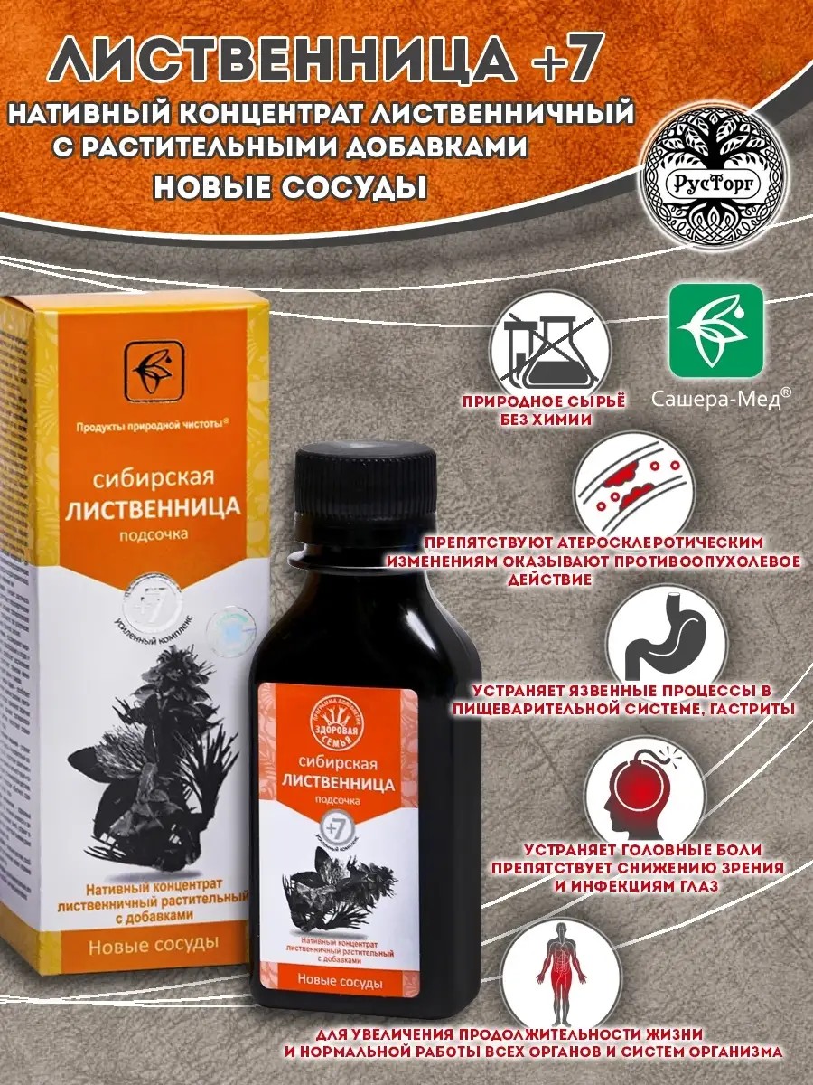 Лиственница сибирская подсочка +7 это уникальный усиленный комплекс, который воздействует на семь жизненно важных органов и систем, контролирующих сердечно-сосудистую деятельность (сосуды, сердце, головной мозг, капилляры, вены, система лимфооттока, нервно-рефлекторная регуляция и дыхательная система). Функциональное состояние этих семи жизненно важных систем определяет, насколько организм способен справиться с существующими и сопутствующими заболеваниями. Особенность комплекса в том, что курсовой приём нормализует давление даже при хронической гипертонии (или гипотонии), восстанавливает кровоснабжение конечностей, препятствует дистрофическим изменениям органов, включая головной мозг. Предотвращает дегенеративные изменения зрения, улучшает состав и реологию крови, убивает инфекции и вирусы в крови и лимфе, восстанавливает потенцию, препятствует старческим изменениям, восстанавливает гомеостаз.Комплекс лиственницы настолько гармонично воздействует на организм, что даже при самых серьезных заболеваниях способствует улучшению самочувствия, т.к. нормализуется состояние сосудов, крови, лимфы и сердца, которые отвечают за мобилизацию организма и устранение причин и последствий заболевания. Ежедневное употребление комплекса «Лиственница сибирская подсочка +7» даже у здоровых и молодых людей способствует устранению последствий пагубного воздействия внешних условий (радиация, употребление продуктов, содержащих ГМО, электромагнитные излучения и т.д.). При любых изменениях организма комплекс одновременно адаптирует организм к изменениям внешней среды: устраняет болевой симптом, воспалительный процесс, изменения нервной системы, нарушение гормональной, сердечно-сосудистой, мозговой деятельности, дегенеративные изменения функций мочеполовой, пищеварительной и опорно-двигательной систем. Состав: вода, кора лиственницы сибирской, корневища диоскореи ниппонской, цветки клевера, плоды черники, корень и листья бадана, мумиё алтайское очищенное, живица лиственничная, сагаан-дали, циста артемии, ястребинка, леспедеца копеечниковая, уснея, каменное масло, мёд.Способ применения: внутрь по 1 ч.л. 3 раза в день за 30 мин до еды. Курс приёма – 30 дней. Кора лиственницы содержит натуральный усваиваемый дигидрокверцетин, оказывает мощное противовоспалительное и противоаллергенное действие, укрепляет и восстанавливает соединительную ткань, способствует снижению уровня холестерина, укрепляет сосуды и капилляры, улучшает микроциркуляцию крови, препятствует образованию тромбов, снижает воспалительные явления в мочеполовых органах, укрепляет иммунитет, защищает от вредных воздействий желудок и печень, активизирует процесс регенерации слизистой желудка, оказывает выраженную профилактику основных заболеваний старения (рак, сердечно-сосудистые заболевания, болезни мозга и др.), повышает устойчивость тканей организма к повреждающему воздействию алкоголя и избыточного содержания сахара в крови, снижает вероятность заболевания диабетом, а также облегчает течение развившихся форм, оказывает положительное воздействие на нервную систему, активизирует нервные процессы. Противопоказания: индивидуальная непереносимость компонентов продукта.Условия хранения: хранить при температуре не выше 25 °С, избегая попадания прямых 