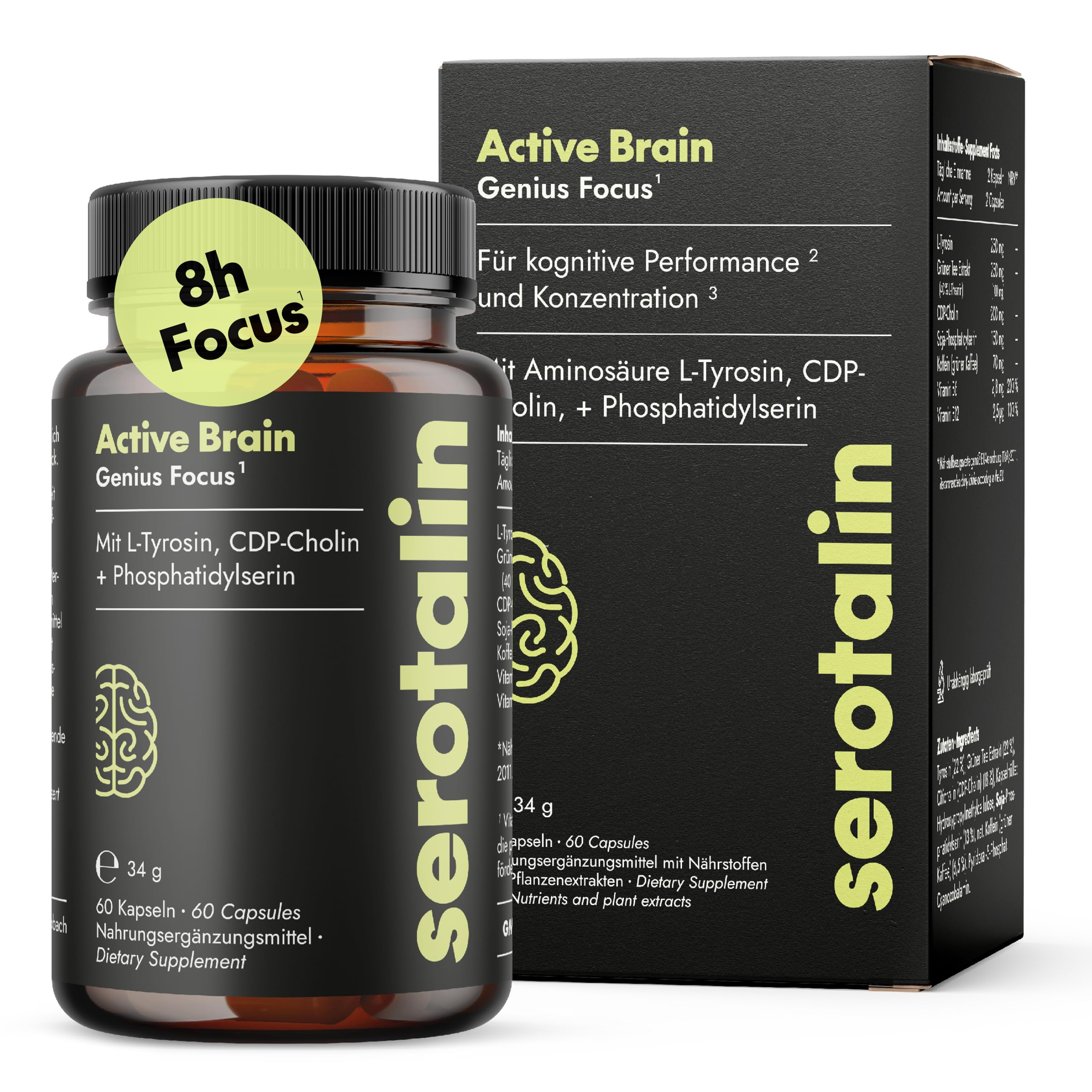 Vegan and made in Germany – We rely on the finest raw materials and the highest purity. Our vitamin capsules are vegan and free from additives such as magnesium stearate, colorings, gelatin, and preservatives. Lactose-free, gluten-free, and GMO-free. No risk of addiction: Our formulations are designed to support your body long-term without causing dependence or habituation. Regular research by independent German laboratories guarantees the highest product quality. Natural daily support: Serotalin combines high-quality plant-based ingredients with essential vitamins. All-in-one capsules: In addition to valuable vitamins, we rely on premium plant-based substances. Adults take 2 capsules daily. We recommend taking them in the morning with breakfast. Depending on your caffeine tolerance, you may be able to skip your morning coffee. NATURAL SUPPORT: Our capsules form a unique combination of selected ingredients, amino acids, and vitamins. Our product is particularly well tolerated. The 60 capsules provide a one-month supply.Végétalien et fabriqué en Allemagne - Nous misons sur les meilleures matières premières et la plus grande pureté. Nos capsules vitaminées sont végétaliennes et exemptes d'additifs tels que le stéarate de magnésium, les colorants, la gélatine et les conservateurs. Sans lactose, gluten et OGM. Aucun risque de dépendance : nos formulations sont conçues pour soutenir votre corps à long terme sans dépendance ni provoquer des effets d'accoutumance. Des recherches régulières par des laboratoires allemands indépendants vous garantissent la plus haute qualité de produit. Soutien naturel au quotidien : serotalin combine des ingrédients à base de plantes de haute qualité avec des vitamines essentielles. Capsules tout-en-un : en plus des vitamines précieuses, nous misons sur des substances végétales de qualité supérieure. Les adultes prennent 2 capsules par jour. Nous vous recommandons de le prendre le matin avec un petit déjeuner. Selon la façon dont vous tolérez la caféine, vous pourrez vous passer de votre café le matin. SUPPORT NATUREL : nos capsules forment une combinaison unique d'ingrédients sélectionnés, d'acides aminés et de vitamines. Notre produit est particulièrement bien toléré. Les 60 capsules sont votre stock pour un mois.serotalin GENIUS BRAIN Capsules Avec CDP Choline L-Tyrosine Vitamine B6 Vitamine B12 60 gélules végétaliennes