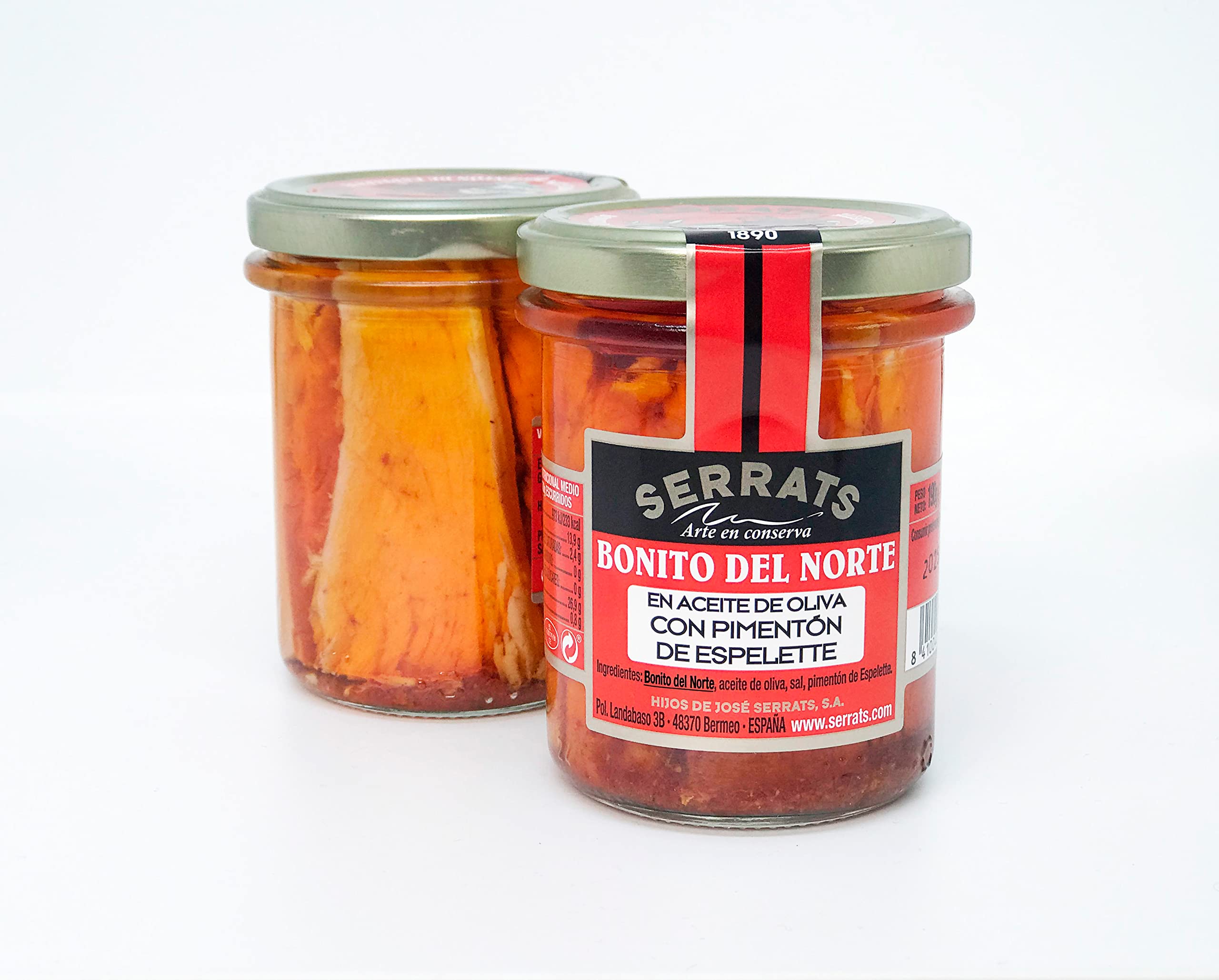 The Bonito del Norte is caught one by one in the waters of the Bay of Biscay during the summer coast and with traditional fishing gear. Its intense taste of the sea, its clear flesh and its properties have made it without a doubt the king of the Conservas Serrats. When purchg this product you take 12 glass jars of 190g each, containing Bonito del Norte del Cantábrico in Olive Oil and Espelette Paprika. This pepper, typical of the southern French village of Espelette, gives it that reddish color, and a hint of flavor and a unique spicy touch. These preserves are handmade in a completely handmade mannerSERRATS - 12 Stuks - Bonito del Norte del Cantábrico in Olijfolie met Espelette Paprika 190g De Bonito del Norte wordt één voor één gevangen in de wateren van de Golf van Biskaje tijdens de zomerkust en met traditioneel vistuig. De intense smaak van de zee, het heldere vlees en de eigenschappen hebben het zonder twijfel de koning van de Conservas Serrats gemaakt. Bij aankoop van dit product neemt u 12 glazen potten van elk 190g, die Bonito del Norte del Cantábrico in Olijfolie en Espelette Paprika bevatten. Deze paprika typisch voor het Zuid-Franse dorpje Espelette, geeft het die roodachtige kleur, en een vleugje smaak en een unieke pittige touch. Deze conserven zijn handgemaakt op een volledig handgemaakte manier