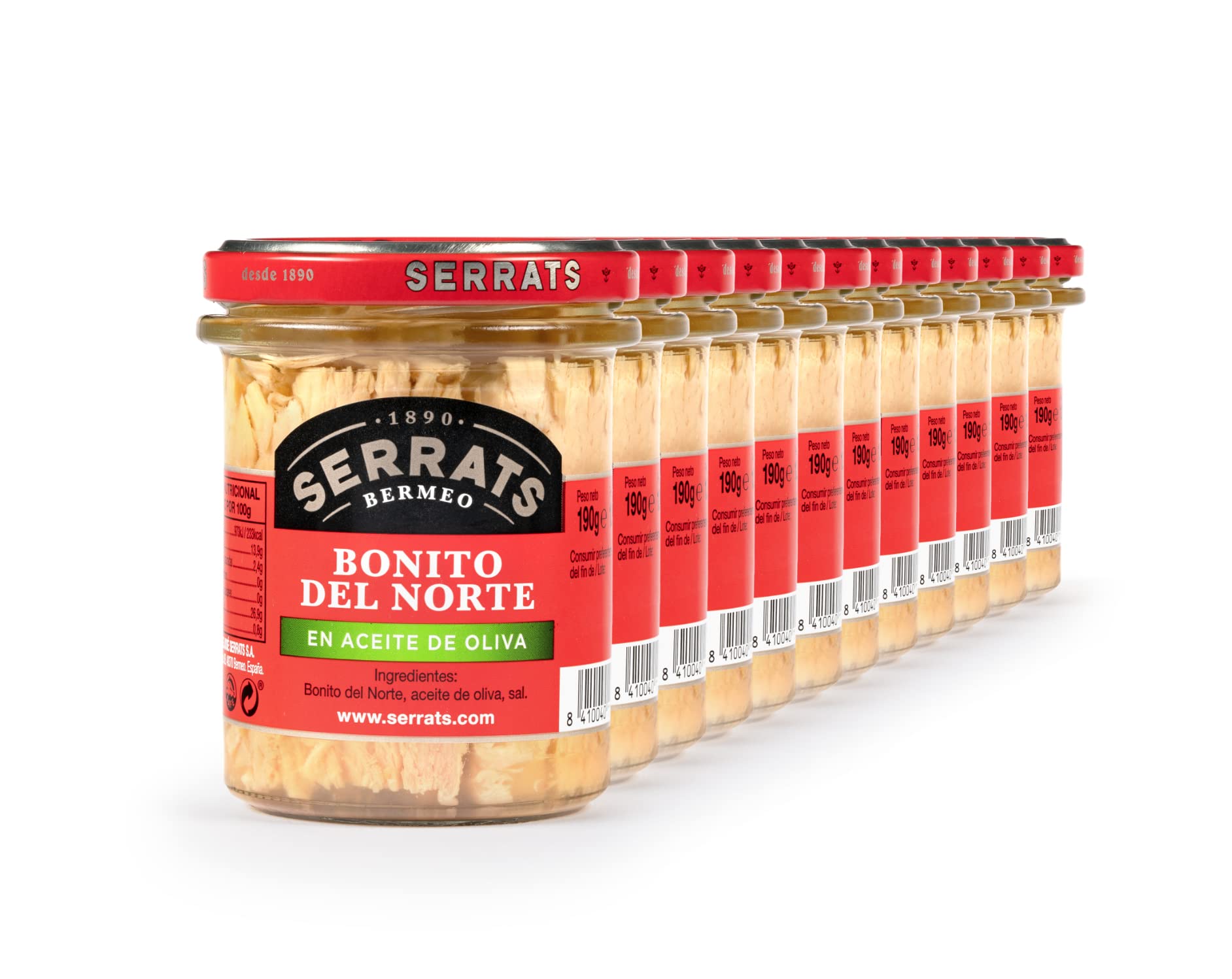 The Bonito del Norte is caught one by one in the waters of the Bay of Biscay during the summer coast and with traditional fishing gear. Its intense taste of the sea, its clear flesh and its properties have made it without a doubt the king of the Conservas Serrats. When purchg this product you take 12 glass jars of 190g each, containing Bonito del Norte del Cantábrico in Olive Oil. These preserves are handmade in a completely handmade mannerSERRATS - 12 Stuks - Bonito del Norte del Cantábrico in Olijfolie 190g De Bonito del Norte wordt één voor één gevangen in de wateren van de Golf van Biskaje tijdens de zomerkust en met traditioneel vistuig. De intense smaak van de zee, het heldere vlees en de eigenschappen hebben het zonder twijfel de koning van de Conservas Serrats gemaakt. Bij aankoop van dit product neemt u 12 glazen potten van elk 190g, die Bonito del Norte del Cantábrico in Olijfolie bevatten. Deze conserven zijn handgemaakt op een volledig handgemaakte manier