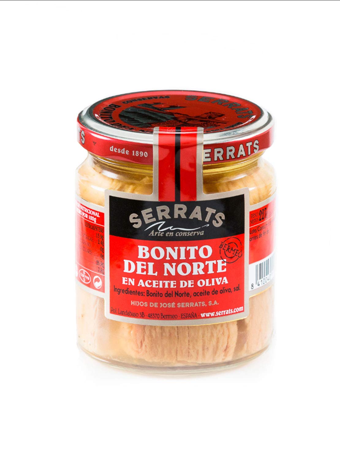 The Bonito del Norte is caught one by one in the waters of the Bay of Biscay during the summer coast and with traditional fishing gear. Its intense taste of the sea, its clear flesh and its properties have made it without a doubt the king of the Conservas Serrats. When purchg this product you take 12 glass jars of 227g each, containing Bonito del Norte del Cantábrico in Olive Oil. These preserves are handmade in a completely handmade mannerSERRATS - 12 Stuks - Bonito del Norte del Cantábrico in Olijfolie 227g De Bonito del Norte wordt één voor één gevangen in de wateren van de Golf van Biskaje tijdens de zomerkust en met traditioneel vistuig. De intense smaak van de zee, het heldere vlees en de eigenschappen hebben het zonder twijfel de koning van de Conservas Serrats gemaakt. Bij aankoop van dit product neemt u 12 glazen potten van elk 227g, die Bonito del Norte del Cantábrico in Olijfolie bevatten. Deze conserven zijn handgemaakt op een volledig handgemaakte manier