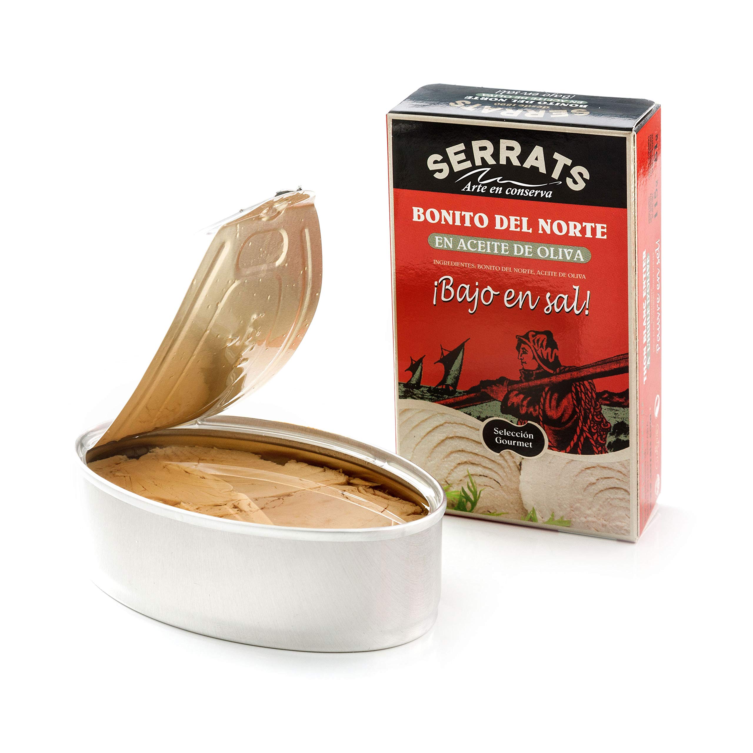The Bonito del Norte is caught one by one in the waters of the Bay of Biscay during the summer coast and with traditional fishing gear. Its intense taste of the sea, its clear flesh and its properties have made it without a doubt the king of the Conservas Serrats. When purchg this product you take 25 cans of 112g each, containing Bonito del Norte del Cantábrico "Low in Salt" in Olive Oil. This Bonito is cooked in unsalted water, so the salt percentage is minimal. These preserves are handmade in a completely handmade mannerSERRATS - 25 Stuks - Bonito del Norte del Cantábrico in Olijfolie Zoutarm 112g De Bonito del Norte wordt één voor één gevangen in de wateren van de Golf van Biskaje tijdens de zomerkust en met traditioneel vistuig. De intense smaak van de zee, het heldere vlees en de eigenschappen hebben het zonder twijfel de koning van de Conservas Serrats gemaakt. Bij aankoop van dit product neemt u 25 blikken van elk 112g, die Bonito del Norte del Cantábrico "Low in Salt" in Olijfolie bevatten. Deze Bonito is gekookt in ongezouten water, waardoor het zoutpercentage minimaal is. Deze conserven zijn handgemaakt op een volledig handgemaakte manier
