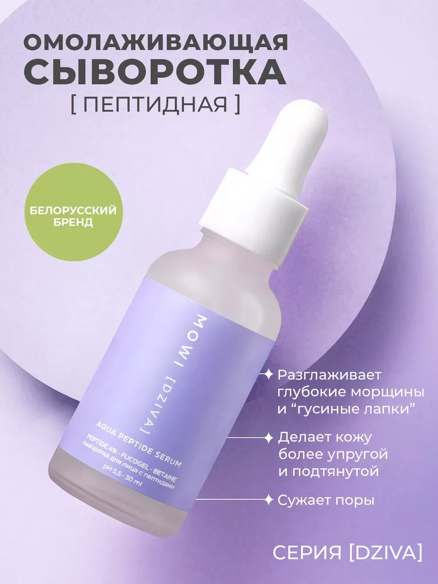 Anti-aging facial serum with peptides from the Belarusian brand MOWI is a unique cosmetic product created using advanced technologies and innovative components to effectively combat the signs of skin aging. The serum contains a powerful complex of active ingredients, including peptides, which are a true breakthrough in anti-aging cosmetics. Peptides promote the synthesis of collagen and elastin, which are responsible for skin firmness and tone. Thanks to peptides, MOWI serum helps smooth existing wrinkles and prevent the appearance of new ones, making skin visibly younger and healthier. Furthermore, the serum contains active ingredients aimed at combating blackheads, which appear as a result of dysfunction of the sebaceous glands and clogged pores. MOWI Anti-aging Serum helps regulate sebum production, cleanses pores, and promotes their tightening, preventing the formation of new blackheads. The serum has a light texture and is quickly absorbed into the skin, leaving no sticky or greasy residue. It is suitable for all skin types, including sensitive and problematic skin. Regular use of MOWI Anti-Aging Serum provides comprehensive skin care, leaving it smooth, firm, and healthy. The MOWI brand is known for its high quality and product safety. All products undergo rigorous testing and meet international standards. By using MOWI Anti-Aging Serum, you are relying on natural ingredients, quality, and effectiveness. This product will become a reliable assistant in the fight for youthful and beautiful skin. Directions for use: Cleanse your face with makeup remover, wash your face with a cleanser (gel or foam), use a toner, apply 2-3 drops of MOWI serum to your face and eyelids with massaging movements. After the serum is completely absorbed, apply cream. Use the MOWI cosmetics set for enhanced results.