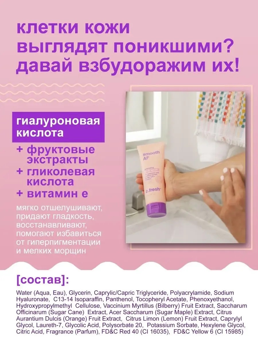 Увлажняйте тело с лосьонами b.fresh ! Побалуйте себя и свою кожу гиалуроновой крем сывороткой от американской уходовой косметики. Мы предлагаем легкий, но очень концентрированный и эффективный уход за кожей - линейку увлажняющих сывороток с кислотами. Bfresh использует только натуральные ингредиенты, которые вы знаете и любите! Твоя кожа сухая и тусклая? Лосьон сыворотка увлажняющая с витамином E и керамидами поможет увлажнить и напитать даже самую сухую кожу, а также восстановить гидролипидный баланс. Хочешь, чтобы твоя кожа сияла? Попробуй натуральную сыворотку для сияния кожи с ниацинамидом. Молочко разглаживает текстуру, а корень лакрицы в составе ухаживающего средства лечит пигментацию и темные пятна. Для мягкого отшелушивания используй фруктовую сыворотку с гликолевой и гиалуроновой кислотой. Он не только обновит клетки, но и избавит от гиперпигментации и мелких морщин. А если твоя кожа выглядит уставшей, то смело бери крем сыворотку с молочной кислотой или с экстрактом чая улун, чтобы взбодрить ее. Но если тебя беспокоит жирная кожа, то беспокоится не стоит, если у тебя будет себорегулирующая крем сыворотка для комбинированной и проблемной кожи. Лосьон содержит экстракт коры ивы и служит противовоспалительным действием, а также улучшает структуру кожи. Органическая уходовая косметика b fresh не содержит такие неприятные вещества, как как парабены; триклозан; спирт; фталаты и пропиленгликоль, а также ни в коем случае не тестируется на животных. Получите невероятные ощущения от использования средства.