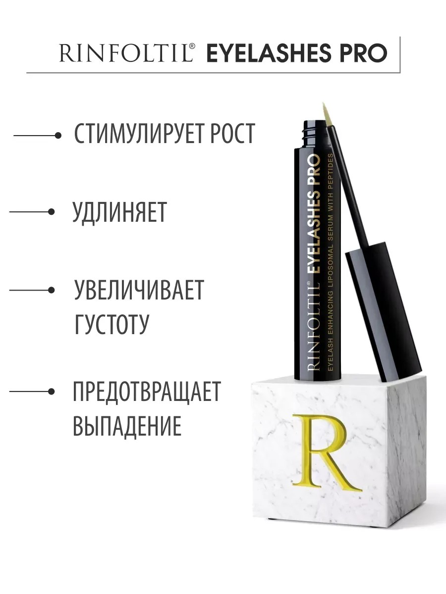 RINFOLTIL EYELASHES PRO, a liposomal eyelash serum with peptides, stimulates growth, lengthens, increases density, and restores eyelashes after extensions and mechanical trauma. This eyelash growth product contains active ingredients in liposomes: green tea extract, ginseng extract, keratin, inositol, D-panthenol, arginine, allantoin, sodium hyaluronate, vitamin E, biotin (vitamin B7), Myristoyl Pentapeptide-17, and Biotinoyl Tripeptide-1. Myristoyl Pentapeptide-17 stimulates keratin production, increases density, and activates eyelash growth. Biotinoyl Tripeptide-1 acts directly on the hair follicles, prolonging the active growth phase, promoting strong fixation of eyelashes in the hair follicles, and stimulating eyelash growth. Biotin and keratin strengthen and thicken eyelashes, repair damaged areas, and prevent breakage. Ginseng and green tea extracts stimulate dormant follicles and improve circulation. RINFOLTIL natural liposomal cosmetics are free of hormones, alcohol, silicones, and mineral oil, and do not cause a withdrawal effect. Directions: Apply the serum with a brush to cleansed skin along the lash line (like eyeliner). Use 1-2 times daily.