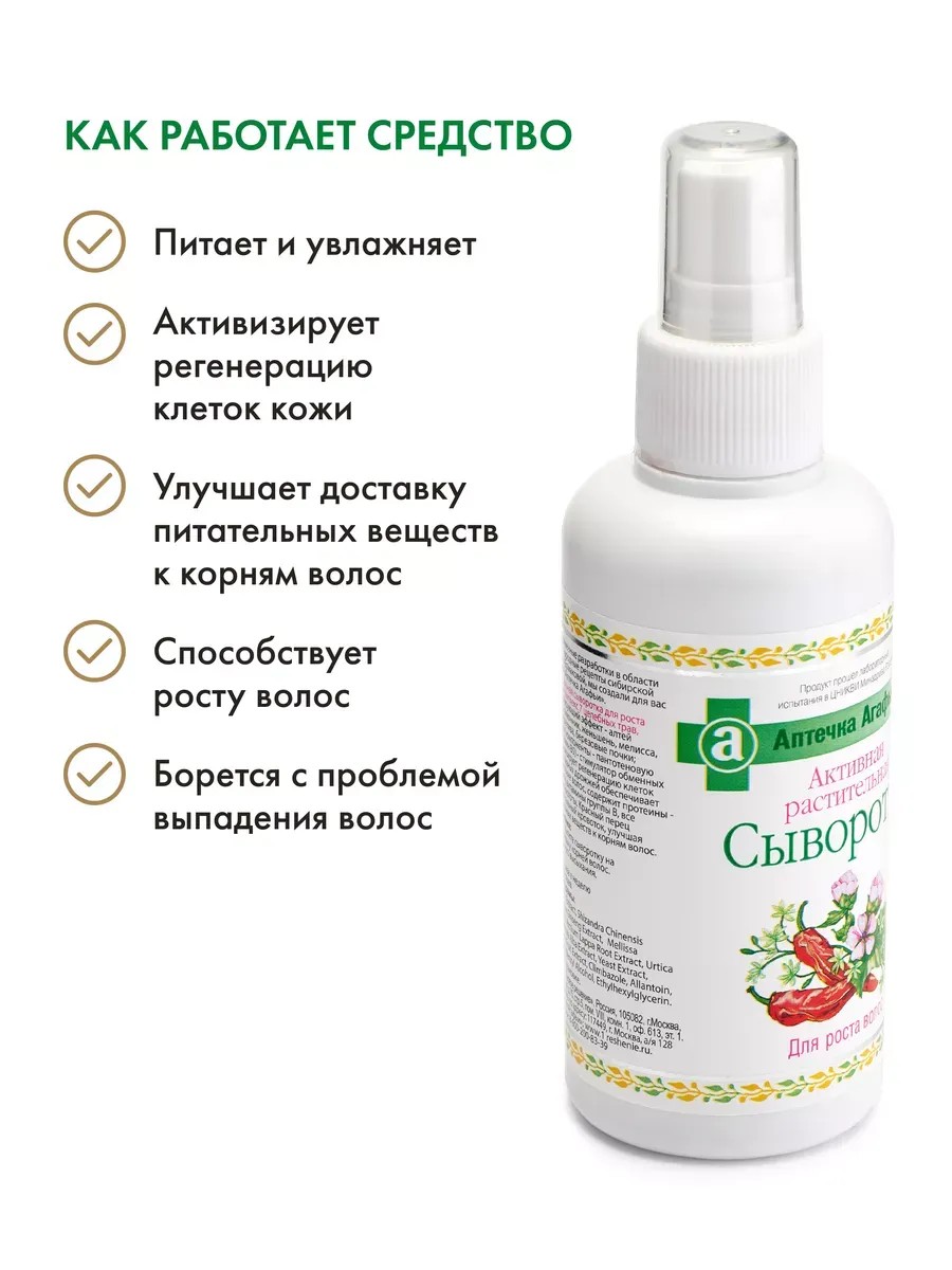Активная растительная сыворотка для роста волос содержит комплекс 7 целебных трав, имеющий стимулирующий эффект – алтей лекарственный, лимонник, женьшень, мелисса, корень лопуха, крапива, березовые почки; а также активные компоненты - пантотеновую кислоту (провитамин В5) - стимулятор обменных процессов. Активизирует регенерацию клеток кожи. Комплекс пивных дрожжей обеспечивает полноценное питание волос, содержит протеины – источник энергии, витамины группы B , все основные аминокислоты. Красный перец - активизирует локальный кровоток, улучшая доставку питательных веществ к корням волос. Продукт прошел лабораторные испытания в ЦНИКВИ Минздрава России.